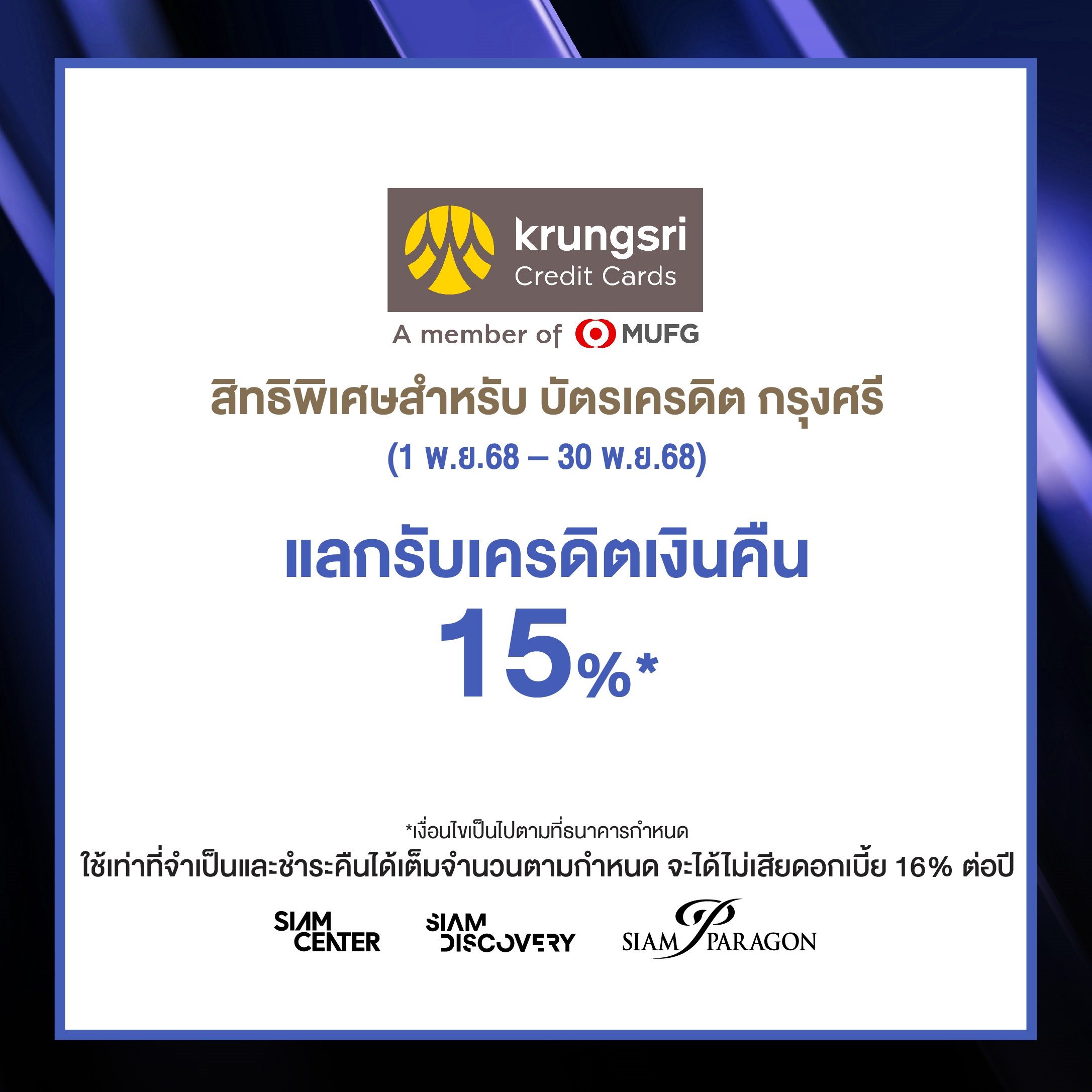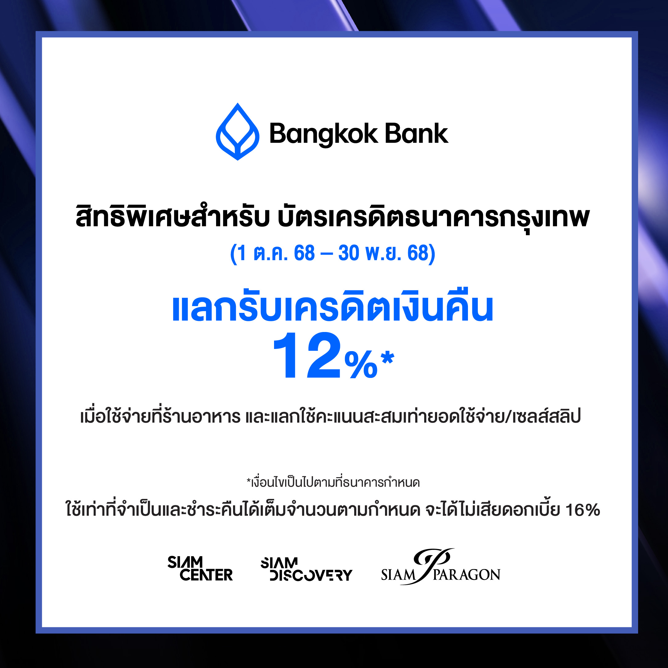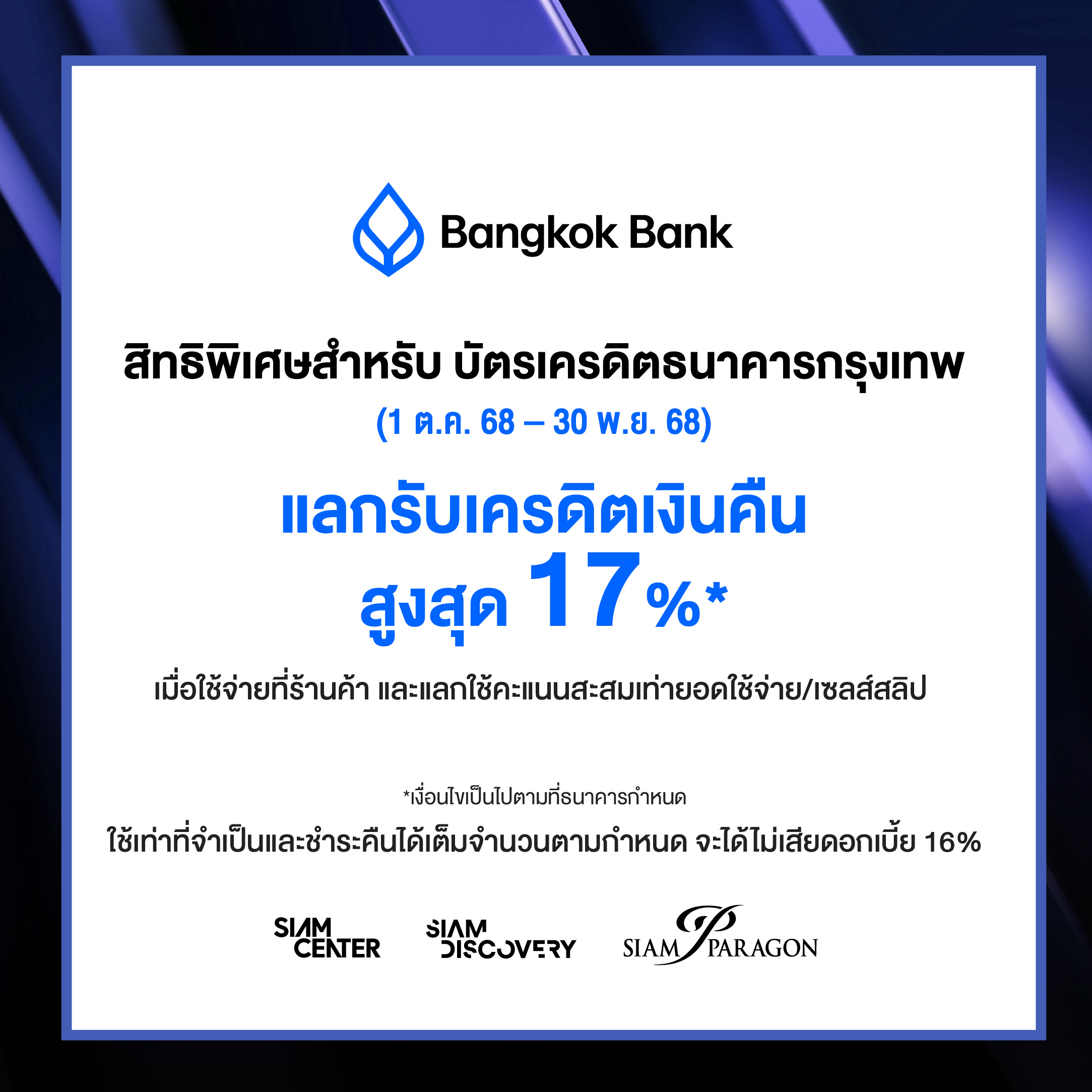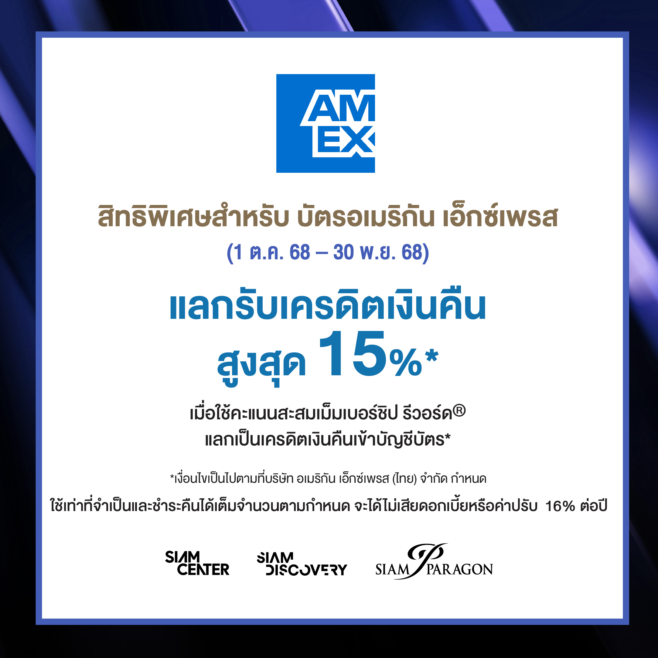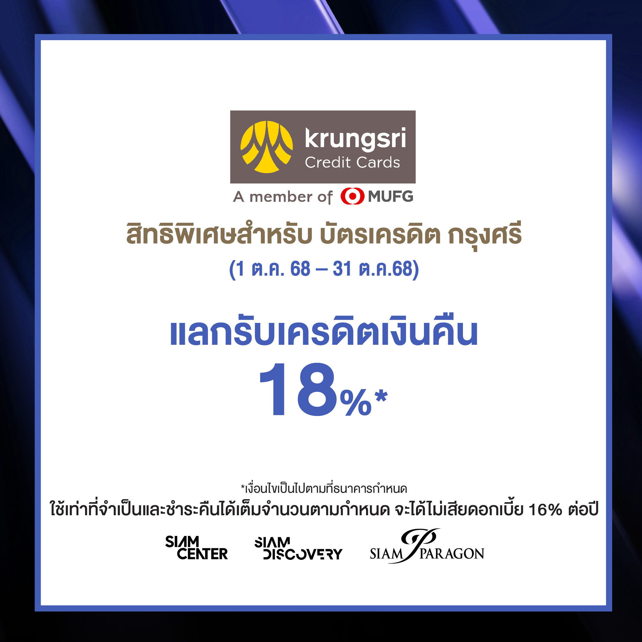 แบ่งจ่าย 0% นาน 6 เดือน* เมื่อซื้อ Siam Gift Card ใบละ 10,000 บาท (ไม่จำกัดยอดซื้อ) + แลกคะแนนรับเครดิตเงินคืน 10% เมื่อใช้คะแนนเท่ายอดซื้อ (ตามเซลล์สลิป)
