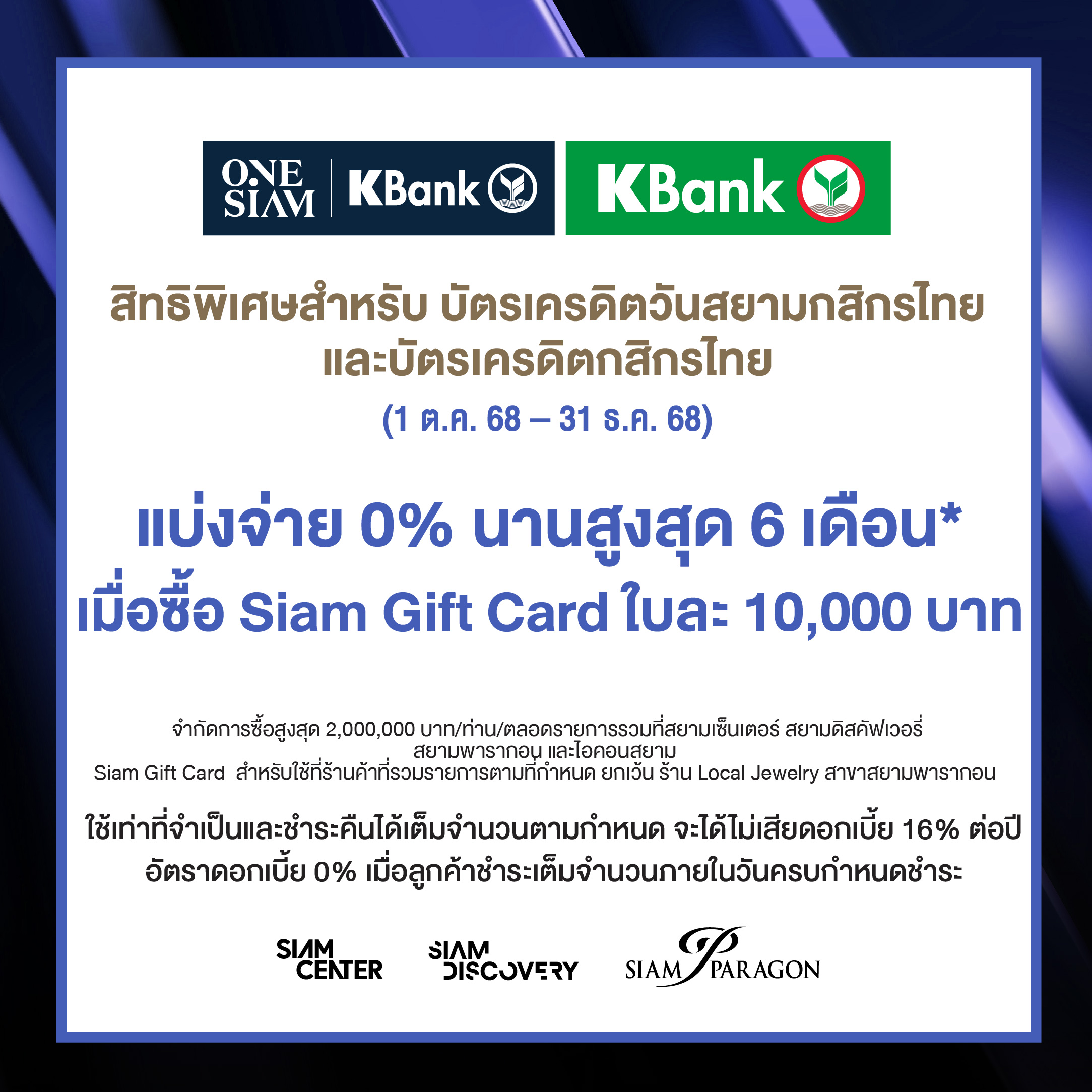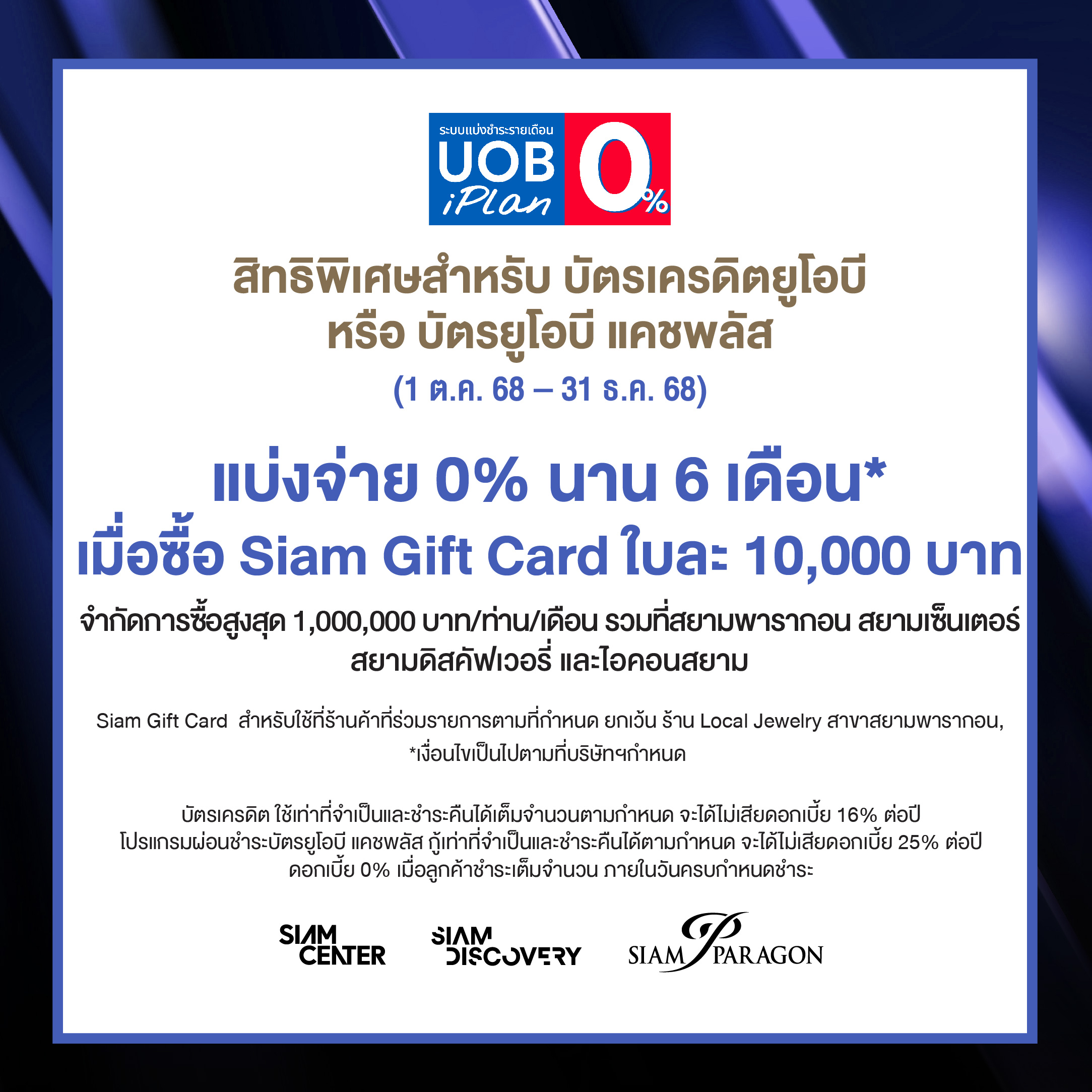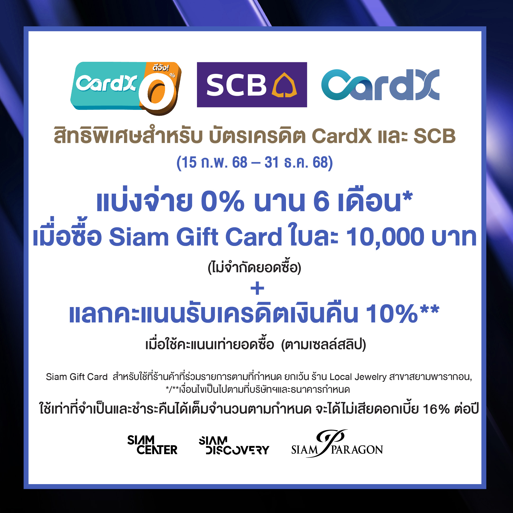 แบ่งจ่าย 0% นาน 6 เดือน* เมื่อซื้อ Siam Gift Card ใบละ 10,000 บาท (ไม่จำกัดยอดซื้อ)