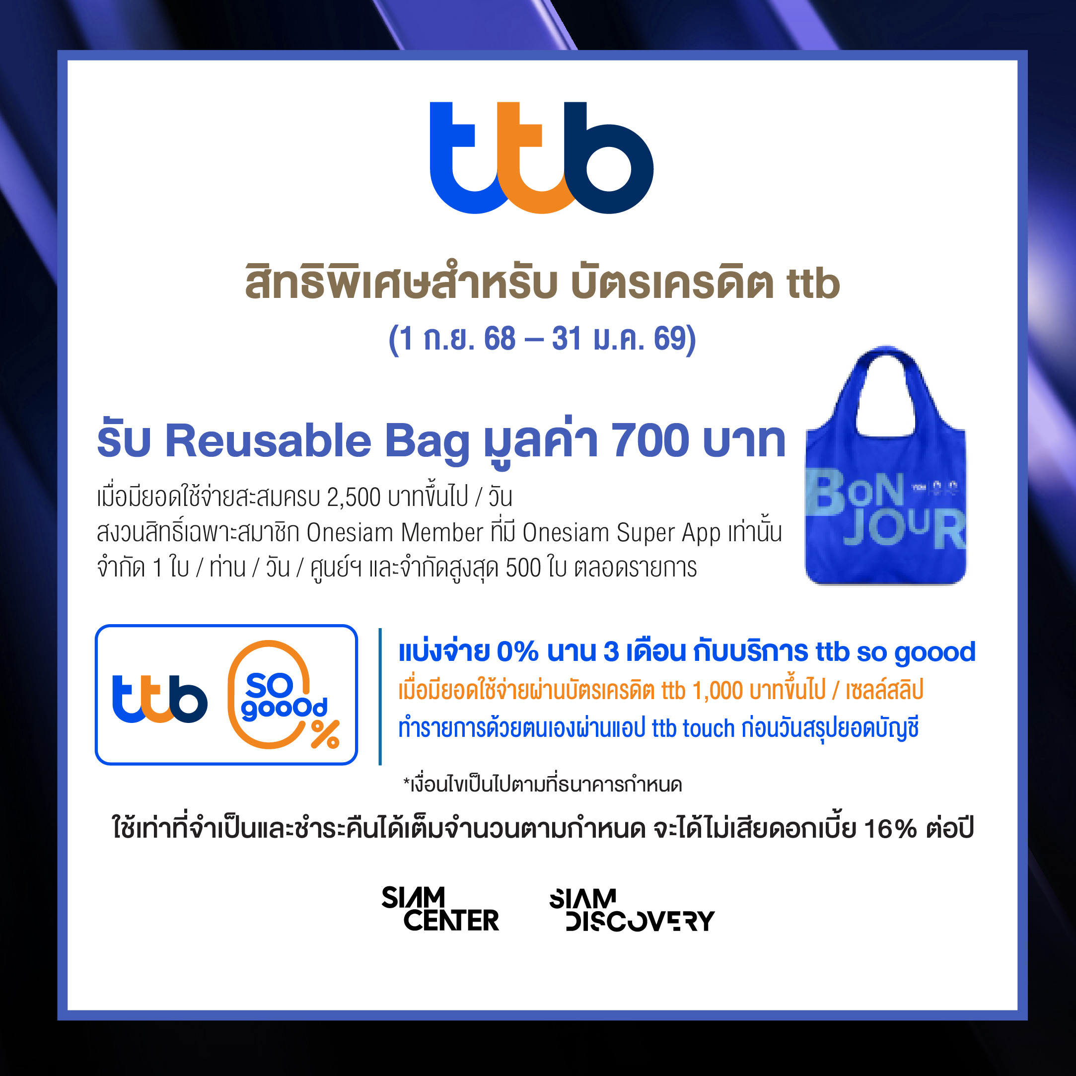 รับ Reusable Bag มูลค่า 700 บาท พร้อมสิทธิ์แบ่งจ่าย 0% นาน 3 เดือน กับบริการ ttb so goood