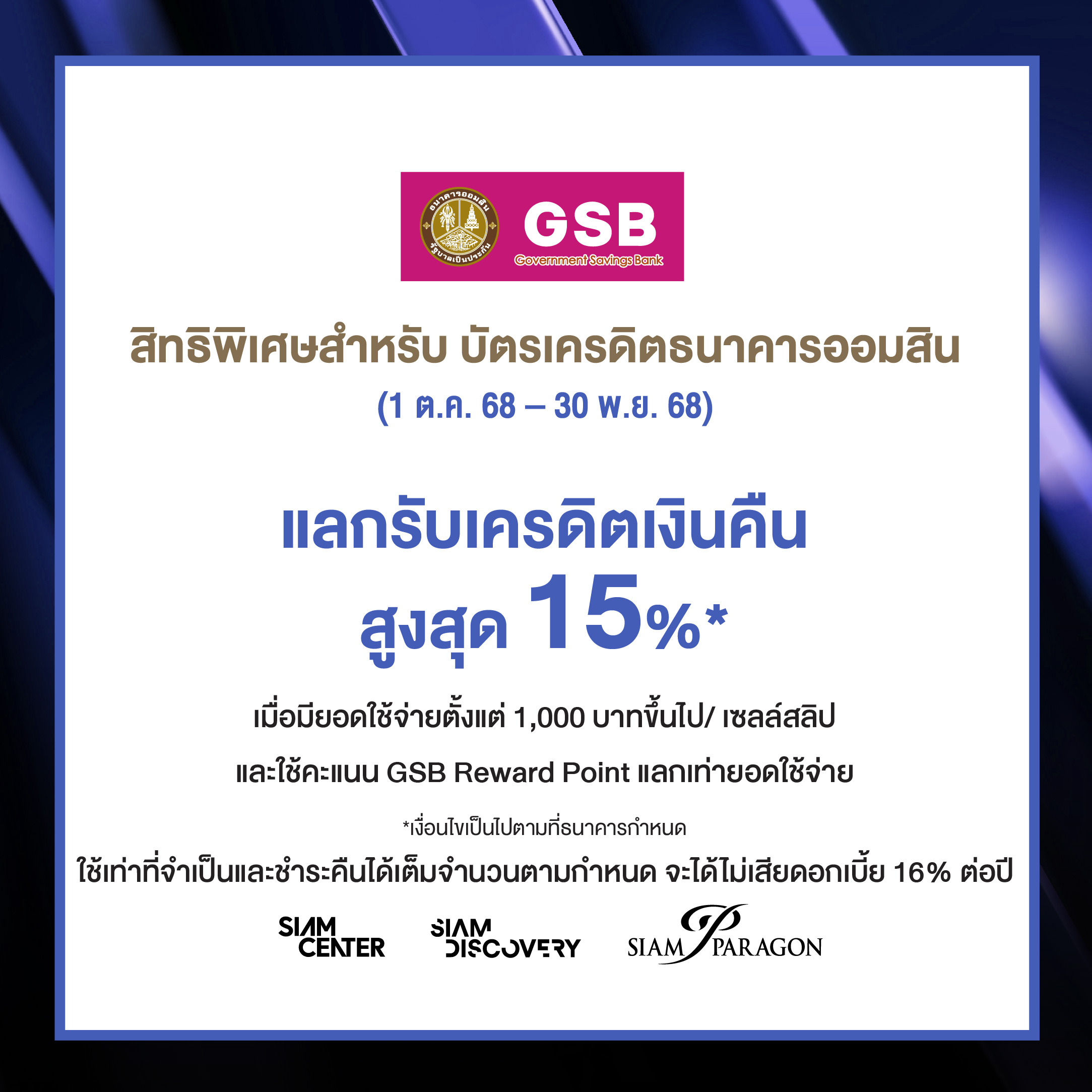 แลกรับเครดิตเงินคืน สูงสุด 15%* เมื่อมียอดใช้จ่ายตั้งแต่ 1,000 บาทขึ้นไป/เซลล์สลิป และใช้คะแนน GSB Reward Point แลกเท่ายอดใช้จ่าย