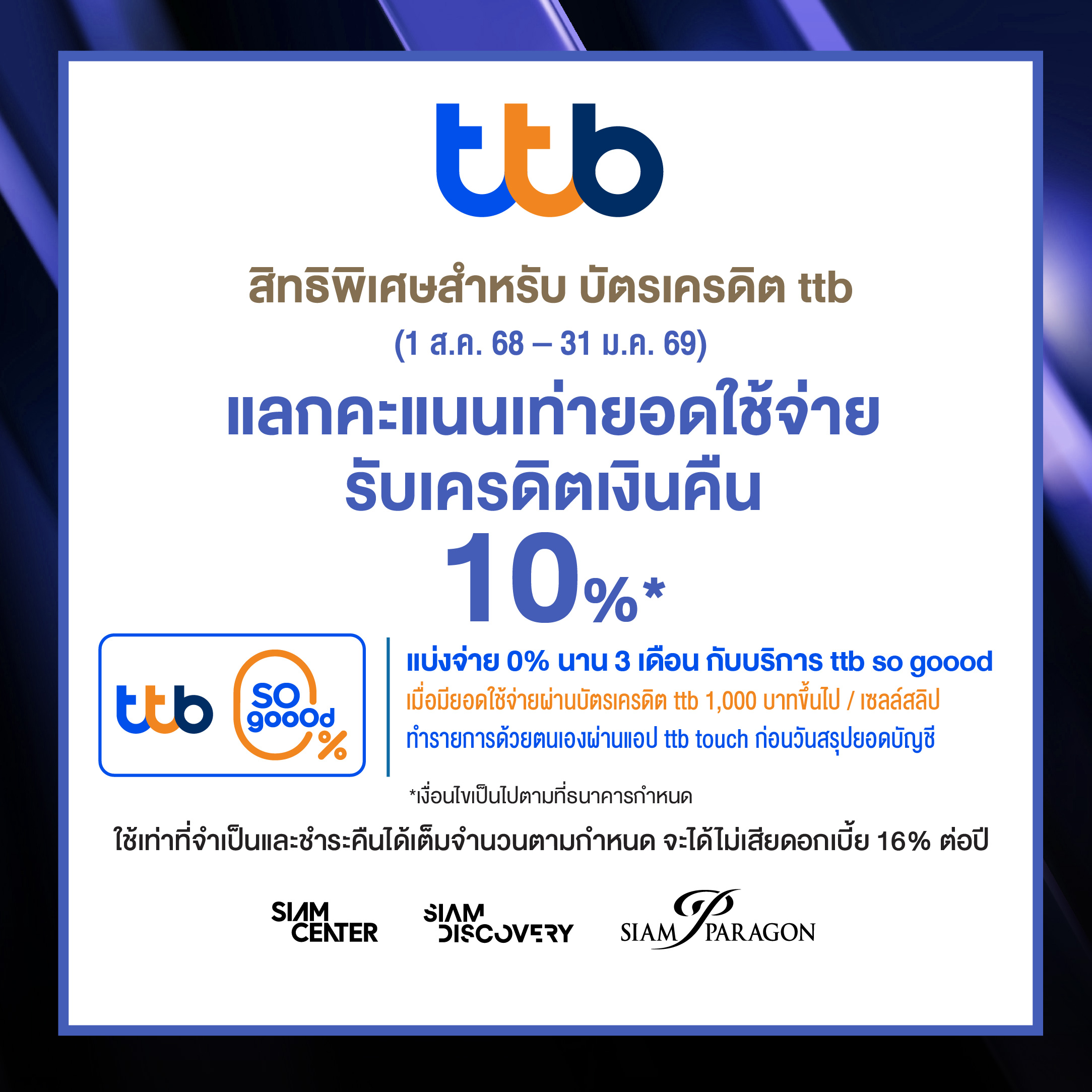 แลกคะแนนเท่ายอดใช้จ่าย รับเครดิตเงินคืน 10%* พร้อมสิทธิ์ แบ่งจ่าย 0% นาน 3 เดือน กับบริการ ttb so goood