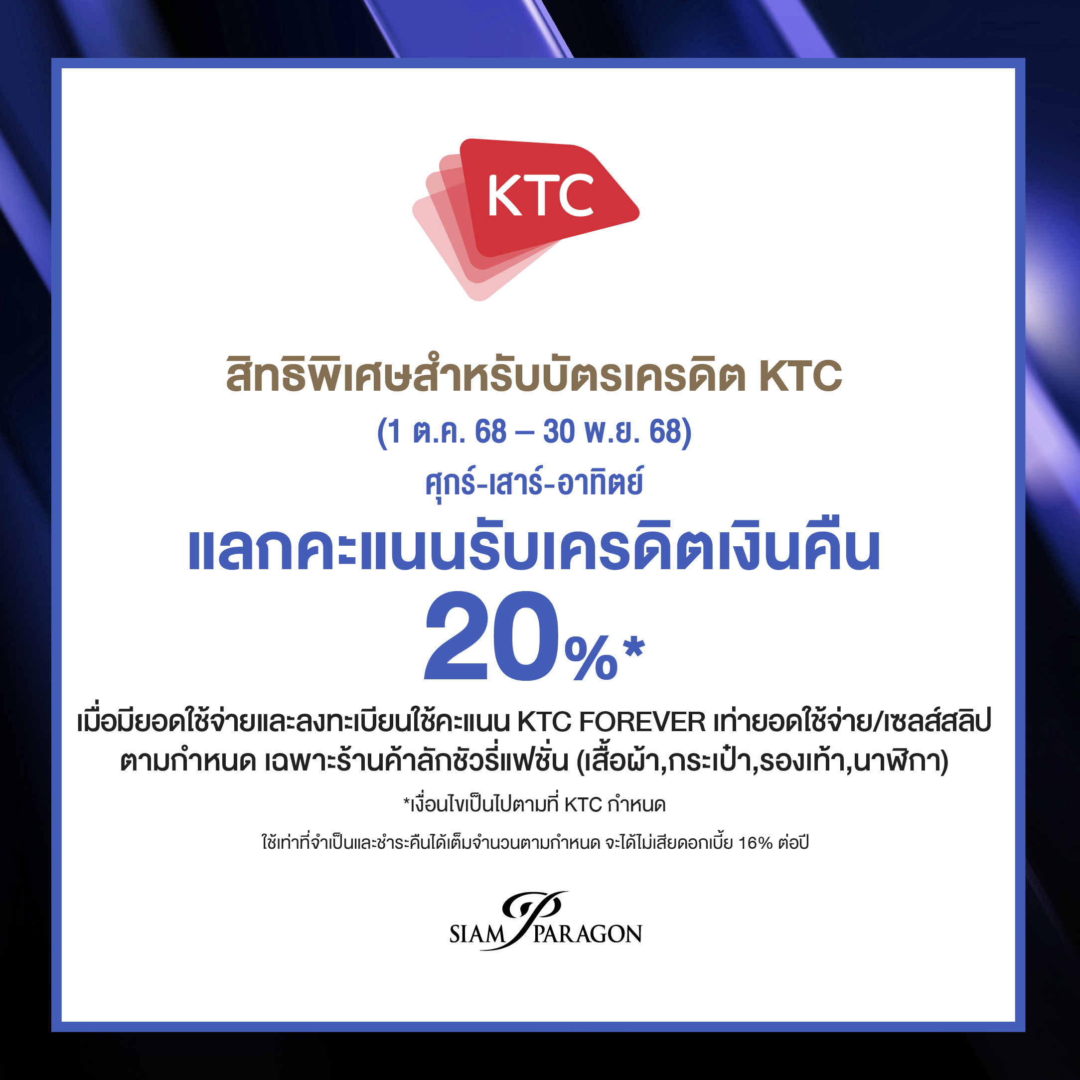 เมื่อมียอดใช้จ่าย และลงทะเบียนใช้คะแนน KTC FOREVER เท่ายอดใช้จ่าย/เซลล์สลิป ตามกำหนด เฉพาะร้านค้ากลุ่มช็อปปิ้งแฟชั่น (เสื้อผ้า, กระเป๋า, รองเท้า, นาฬิกา)
