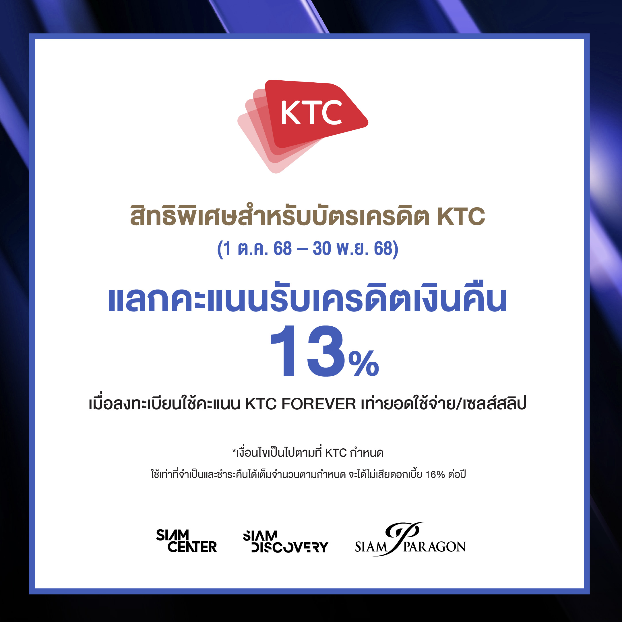 แลกคะแนนรับเครดิตเงินคืน 13% เมื่อลงทะเบียนใช้คะแนน KTC FOREVER เท่ายอดใช้จ่าย/เซลล์สลิป