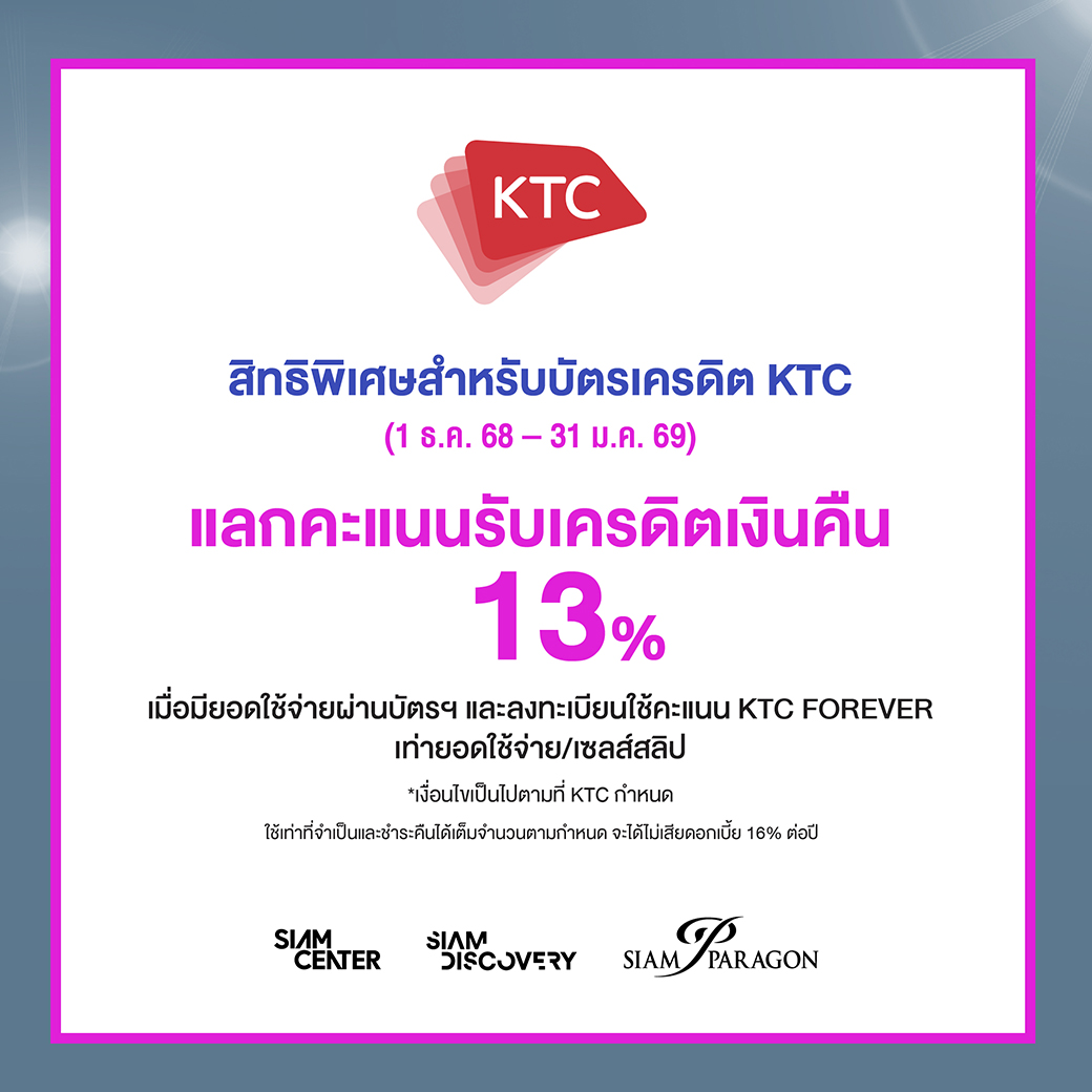 - แลกคะแนนรับเครดิตเงินคืน 13%* เมื่อมียอดใช้จ่ายผ่านบัตรฯ และลงทะเบียนใช้คะแนน KTC FOREVER เท่ายอดใช้จ่าย/เซลส์สลิป