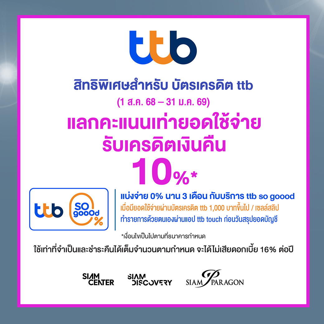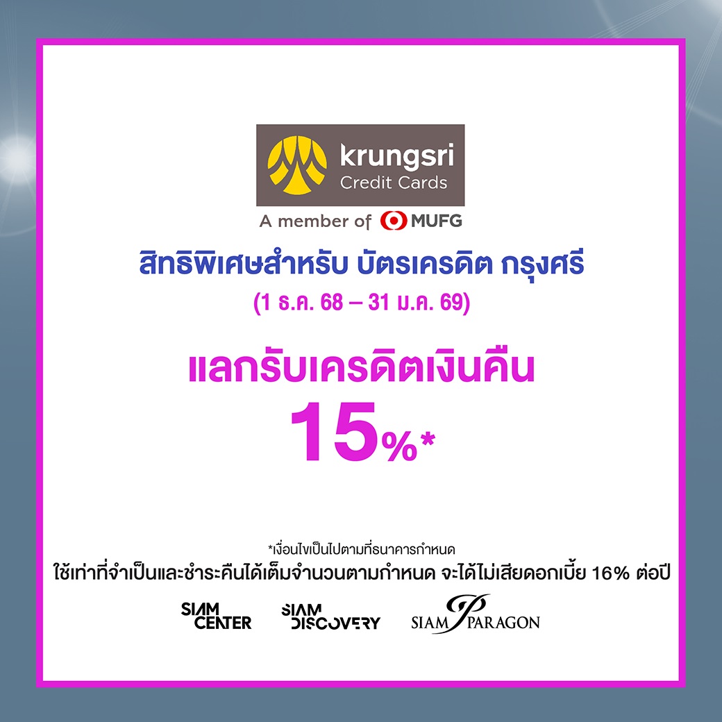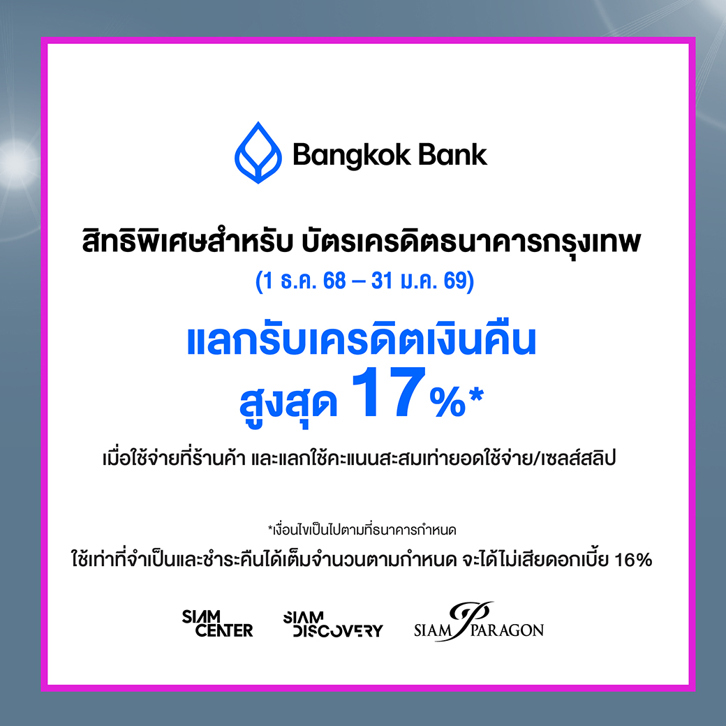 พกบัตรเครดิต มาช็อปกับรายการ Credit Card days แลกคะแนนรับเครดิตเงินคืนสูงสุด 20%* เมื่อช็อปครบตามเงื่อนไข หรือแบ่งชำระ Siam Gift Card 0%* นานสูงสุด 6 เดือน ที่สยามพารากอน สยามเซ็นเตอร์ และสยามดิสคัฟเวอรี่