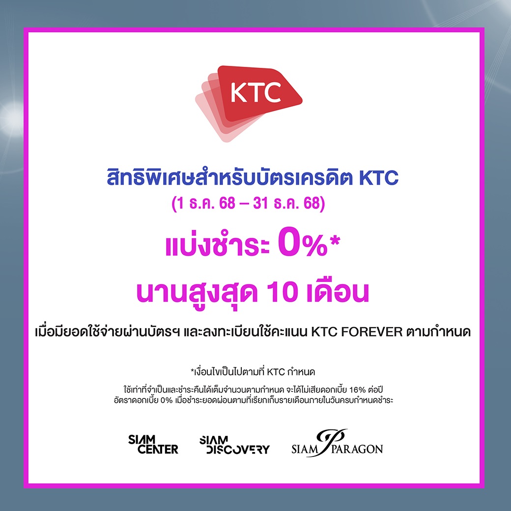 - แบ่งชำระ 0%* นานสูงสุด 10 เดือน เมื่อมียอดใช้จ่ายผ่านบัตรฯ และลงทะเบียนใช้คะแนน KTC FOREVER ตามกำหนด