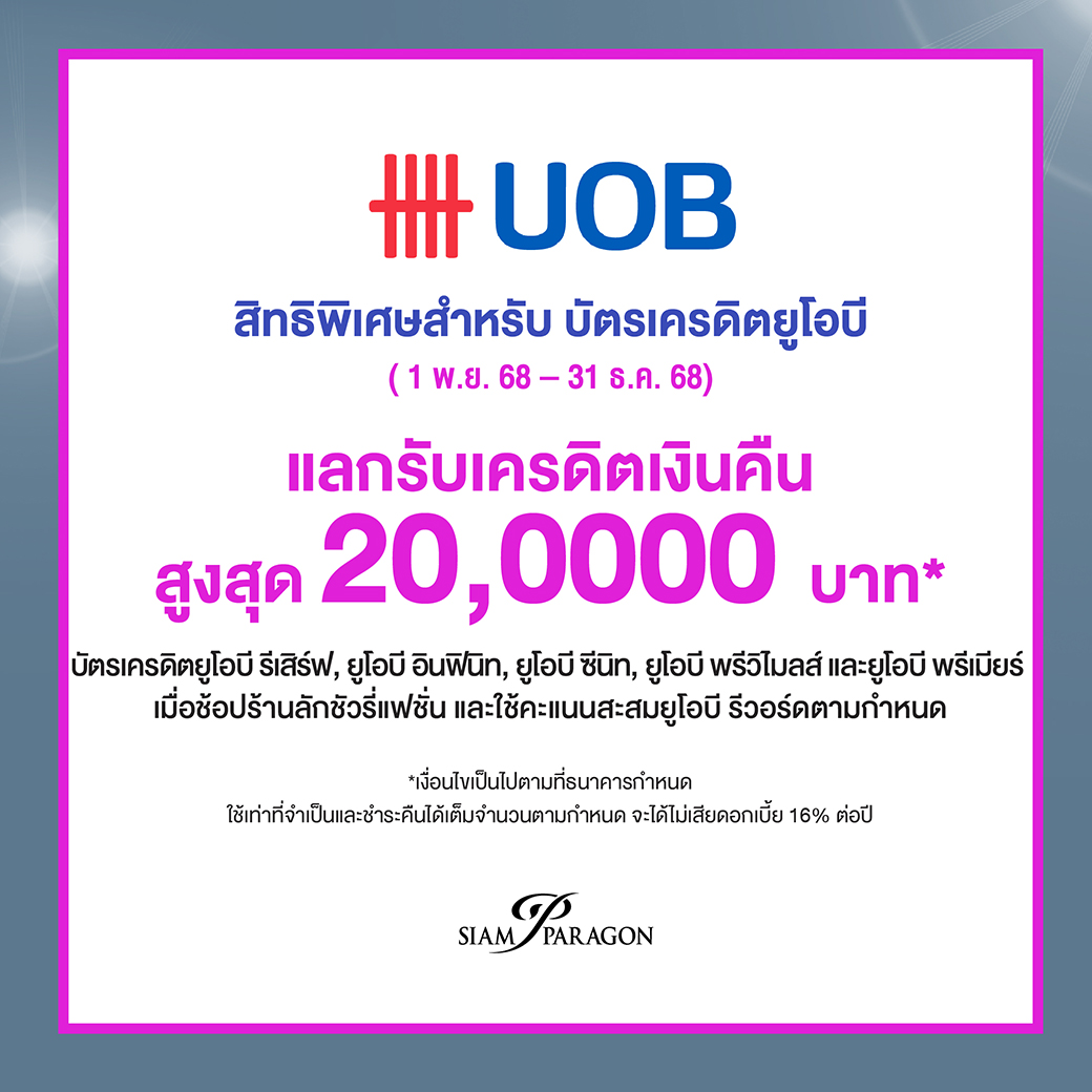 - แลกรับเครดิตเงินคืนสูงสุด 15%* เมื่อใช้คะแนนสะสมยูโอบี รีวอร์ด เท่ากับยอดใช้จ่ายตั้งแต่ 4,000 บาทขึ้นไป/เซลล์สลิป + เฉพาะสาขาพารากอน รับบัตรจอดรถ Siam Car Park 1 ใบ มูลค่า 36,000 บาท* เมื่อมียอดใช้จ่ายผ่านบัตรฯ 200,000 บาทขึ้นไป/เซลส์สลิป
