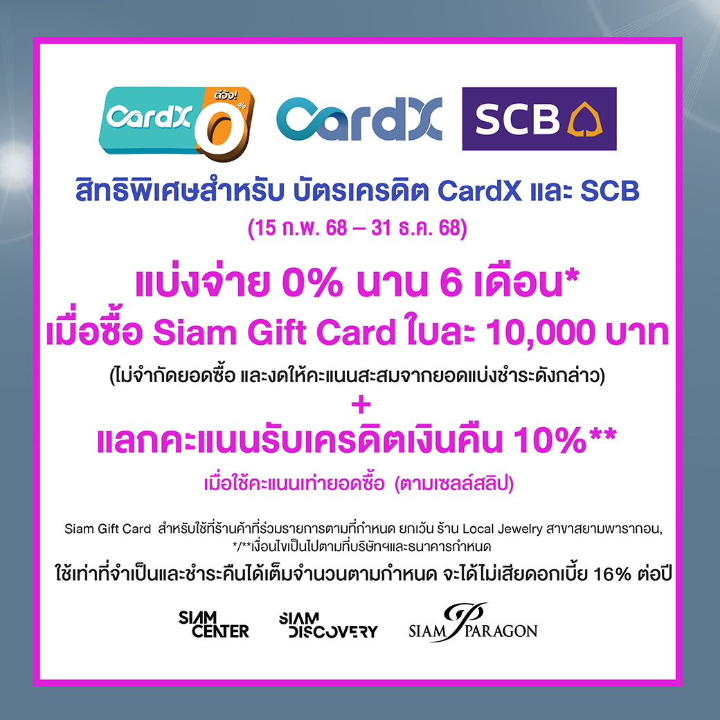 - แบ่งจ่าย 0% นาน 6 เดือน* เมื่อซื้อ Siam Gift Card ใบละ 10,000 บาท