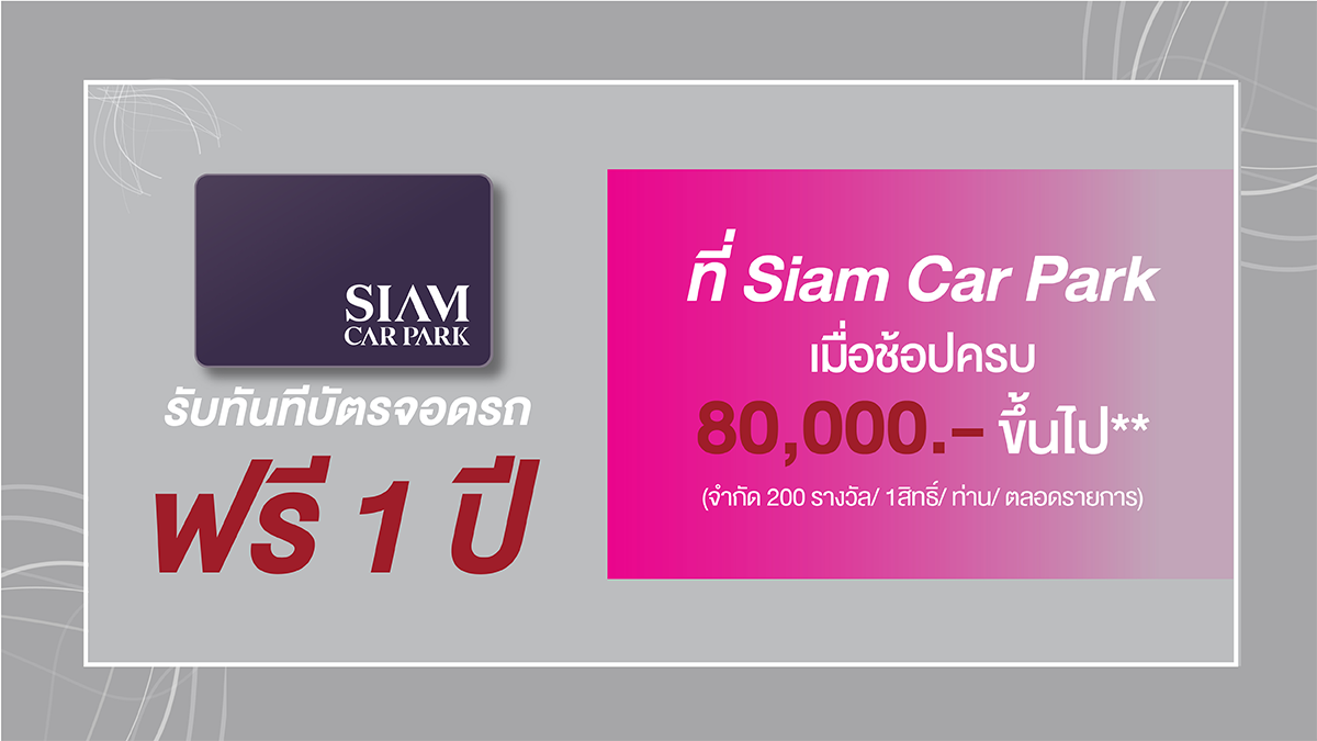 - เมื่อช้อปครบ 80,000.- ขึ้นไป รับทันที บัตรจอดรถฟรี Siam Car Park ฟรี 1 ปี* (จำกัด 200รางวัล / จำกัด 1 สิทธิ์/ท่าน/ตลอดรายการ )