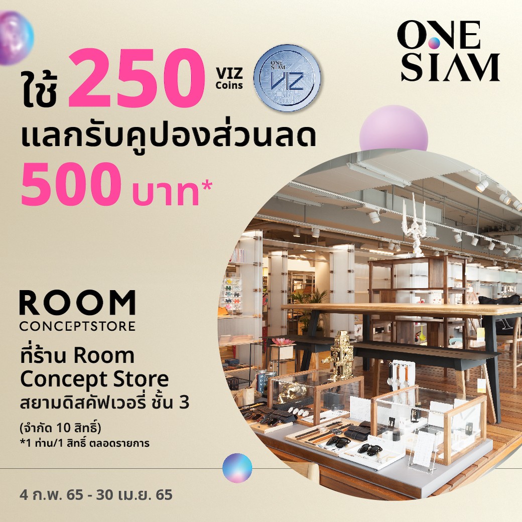 ใช้ 250 VIZ Coins แลกรับคูปองส่วนลดเงินสด มูลค่า 500 บาท ที่ ROOM Concept Store สาขาสยามดิสคัฟเวอรี่ ชั้น 3 (จำกัด 10 สิทธิ์)