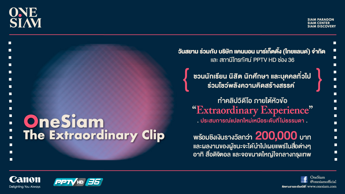 วันสยาม ร่วมกับ บริษัท แคนนอน มาร์เก็ตติ้ง (ไทยแลนด์) จำกัด และ สถานีโทรทัศน์ PPTV HD ช่อง 36 ชวนนักเรียน นิสิต นักศึกษา และบุคคลทั่วไป ร่วมโชว์พลังความคิดสร้างสรรค์ ทำคลิปวิดีโอ ภายใต้หัวข้อ “Extraordinary Experience” ประสบการณ์แปลกใหม่เหนือระดับที่ไม่ธรรมดา ชิงเงินรางวัลกว่า 200,000 บาท พร้อมโอกาสในการแสดงผลงานชนะเลิศผ่านสื่อดิจิตอล และจอขนาดใหญ่ใจกลางเมือง
