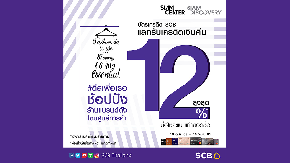 • สิทธิพิเศษนี้สำหรับผู้ถือบัตรเครดิตไทยพาณิชย์ ทุกประเภท ยกเว้น บัตรเครดิต SCB M ทุกประเภท บัตรเครดิต Family Plus และบัตรเครดิตนิติบุคคล (“ผู้ถือบัตร”) เมื่อใช้จ่าย ณ ร้านค้าเช่าที่ร่วมรายการโซนศูนย์การค้าสยามเซ็นเตอร์และสยามดิสคัฟเวอรี่ ระหว่างวันที่ 16 ต.ค. 63 – 15 พ.ย. 63 เท่านั้น และใช้คะแนนสะสมเท่ายอดซื้อแลกรับเครดิตเงินคืน ดังนี้