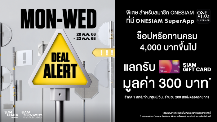 เมื่อช้อปครบ 10,000 บาท ขึ้นไป (ใบเสร็จจาก 2 ร้านค้าขึ้นไป / มูลค่าขั้นต่า 500 บาทขึ้นไปต่อใบเสร็จ) รับ Siam Gift Card มูลค่า 500 บาท (จำกัด 1 สิทธิ์ต่อท่านต่อวัน / จำกัด 500 รางวัลตลอดรายการ)