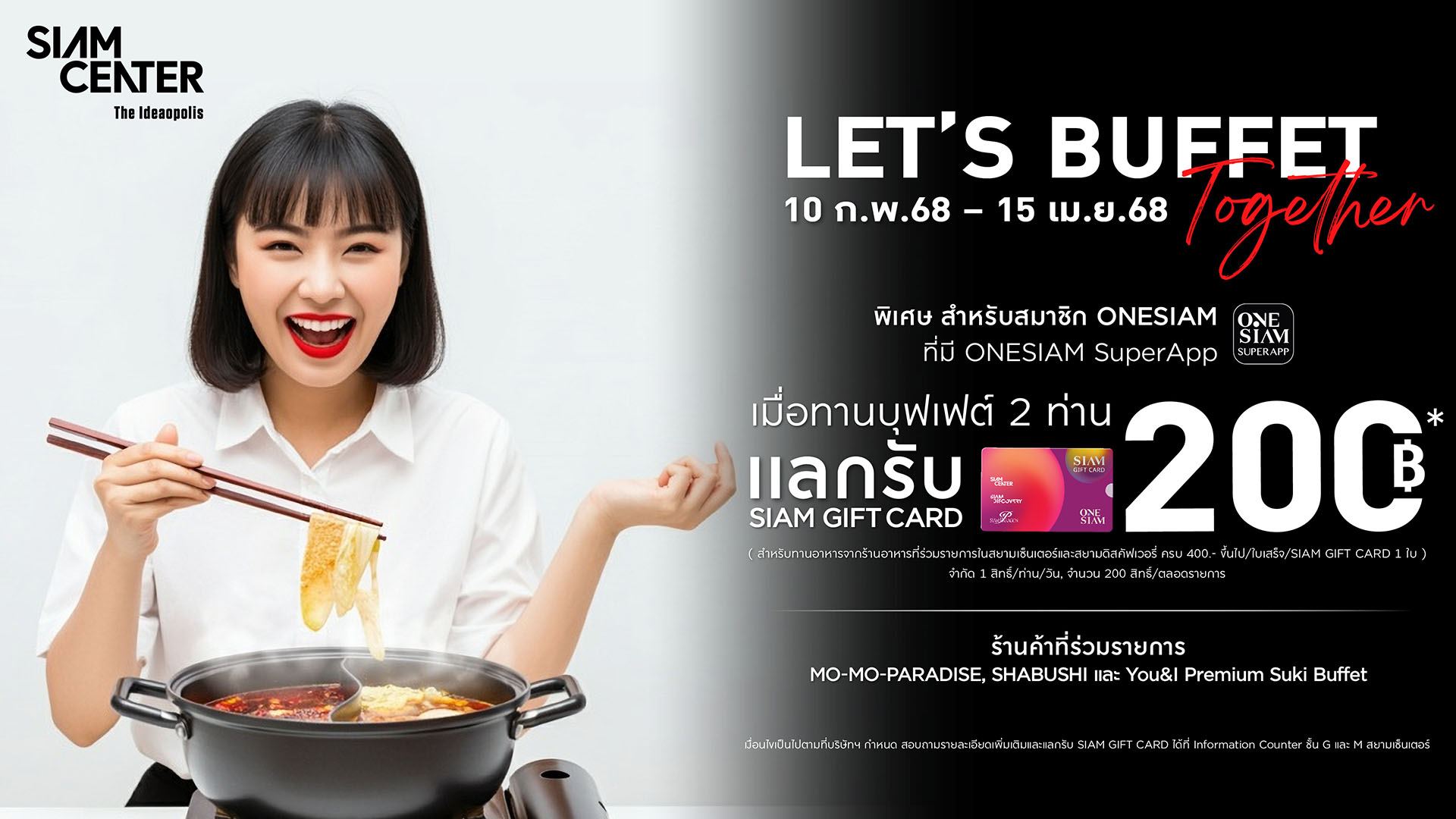 สำหรับสมาชิก ONESIAM MEMBER ที่มี ONESIAM SUPERAPP ที่ทานอาหารจากร้าน MO-MO-PARADISE, SHABUSHI และ YOU & I สาขา สยามเซ็นเตอร์