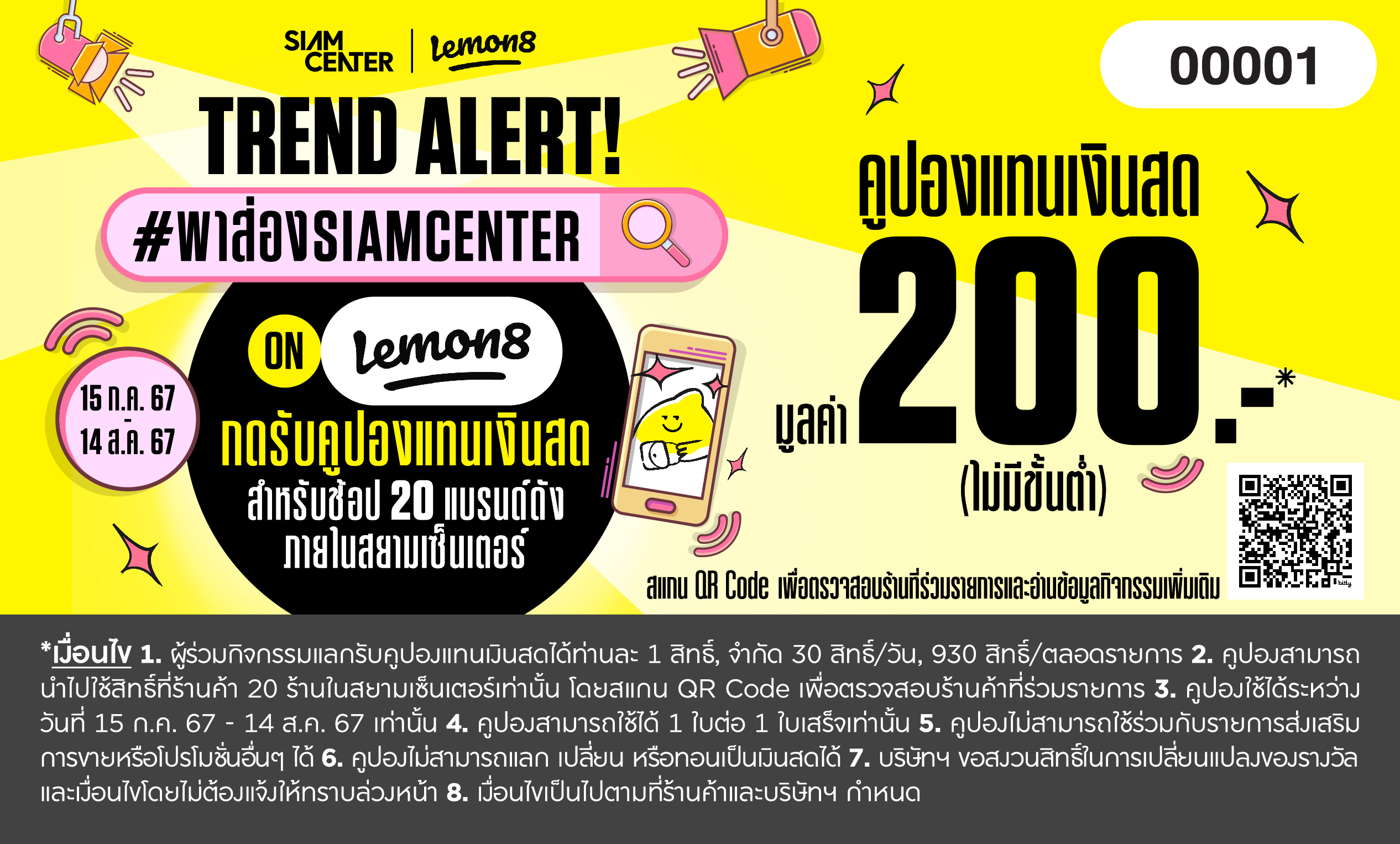 สยามเซ็นเตอร์ The Ideaopolis ฉลองครบรอบ 50 ปี พา Top Creators ตัวตึงจาก Lemon8 เปิด alarm Trend Alert #พาส่องSiamCenter เช็คฮอตไอเท็ม ของใหม่มาแรงเปิดซีซั่นก่อนใคร Sneaker Seeker, Fashion Trend Setter และ Beauty Monster พร้อมกดรับคูปองแทนเงินสด 200 บาท* ช้อปได้เลยทันที! (โดยไม่มีขั้นต่ำ)