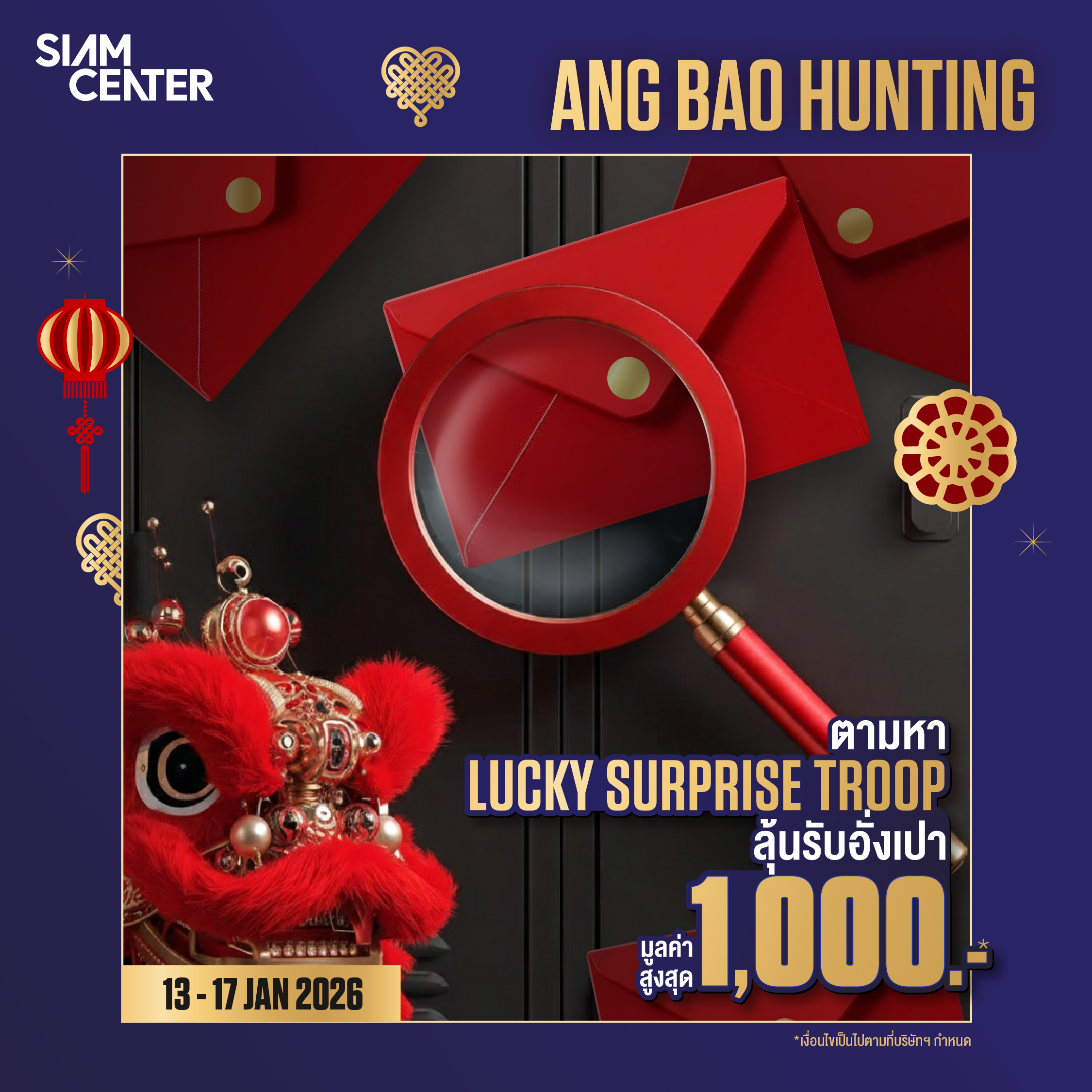 红包多多来! ดื่มด่ำไปกับบรรยากาศแห่งความมั่งคั่ง “Lucky Surprise Troop” ขบวนอุปรากรจีนที่นำพาความโชคดีไปสู่ทุกคนที่พบเจอ ร่วมสนุกไปกับ Ang Bao Hunting มูลค่าสูงสุด 1,000 บาท รวมมูลค่าสูงสุด 300,000 บาท*!