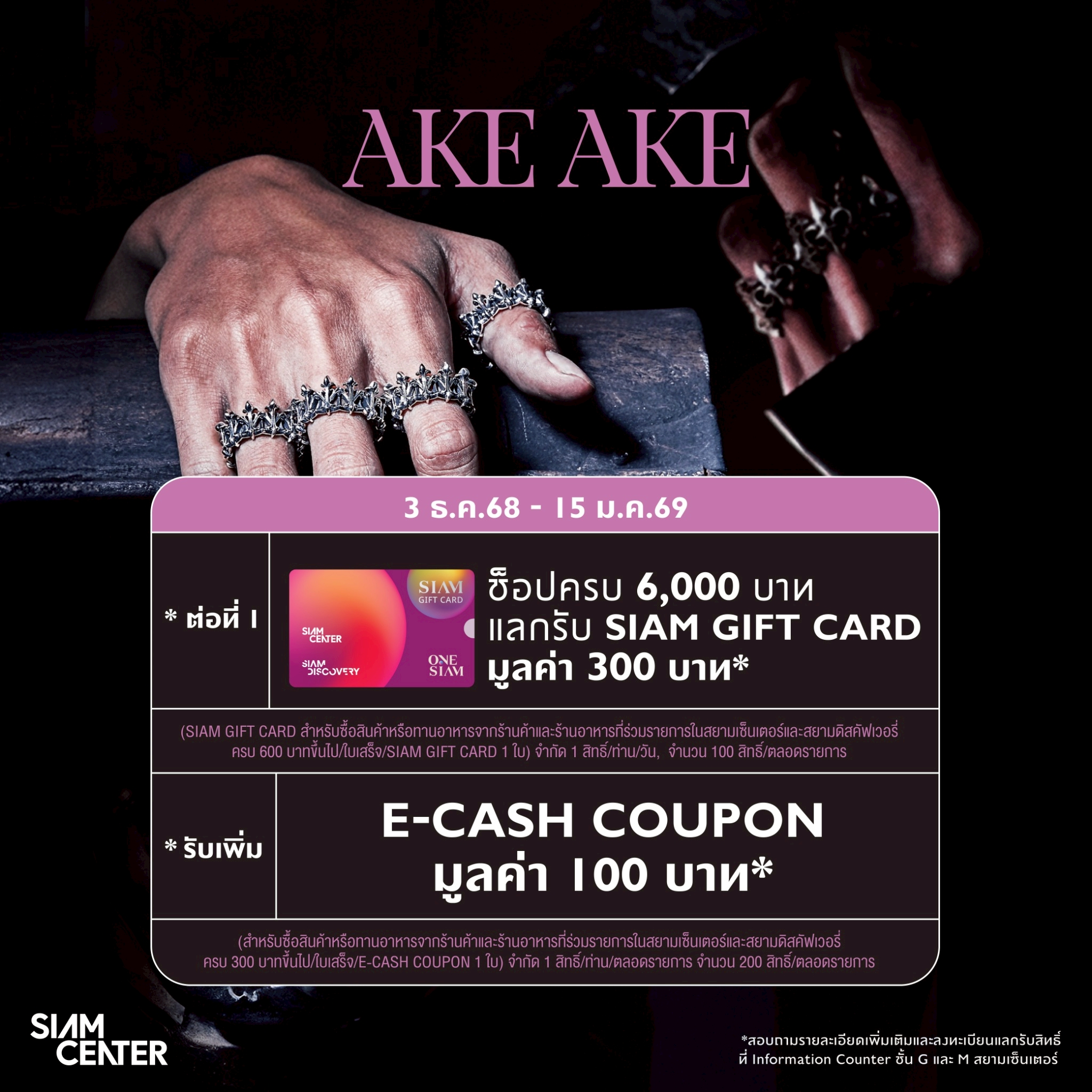 1. รวบรวมใบเสร็จจากการซื้อสินค้าจากร้าน AKE AKE สาขาสยามเซ็นเตอร์ตามเงื่อนไขที่กำหนด ลงทะเบียนแลกรับ SIAM GIFT CARD ภายในวันเดียวกันเท่านั้น ที่จุด Information Counter ชั้น G และชั้น M สยามเซ็นเตอร์
