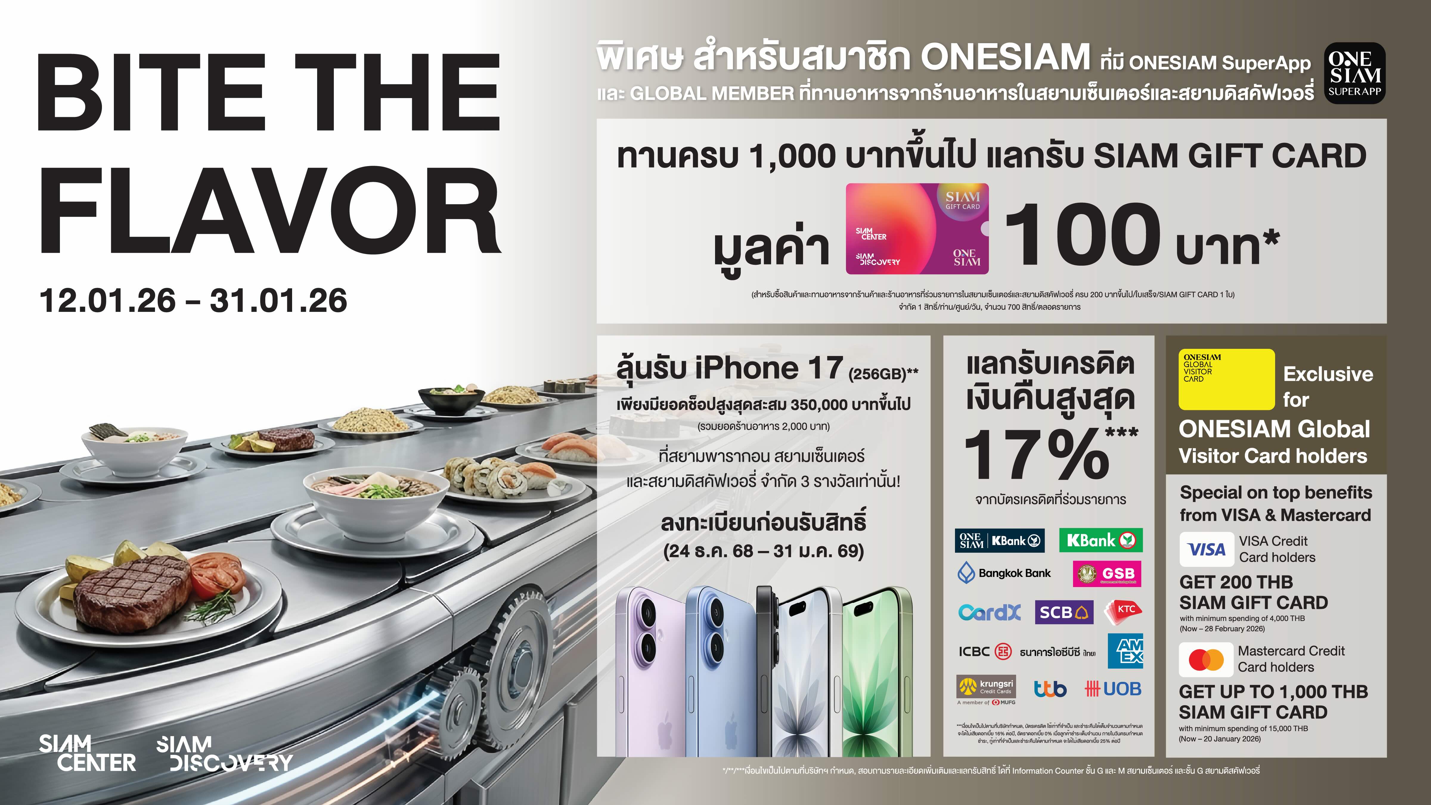 พิเศษ สำหรับสมาชิก ONESIAM ที่มี ONESIAM SuperApp และ GLOBAL MEMBER ที่ทานอาหารจากร้านอาหารในสยามเซ็นเตอร์และสยามดิสคัฟเวอรี่ ทานครบ 1,000 บาทขึ้นไป แลกรับ SIAM GIFT CARD มูลค่า 100 บาท (สำหรับซื้อสินค้าและทานอาหารจากร้านค้าและร้านอาหารที่ร่วมรายการในสยามเซ็นเตอร์และสยามดิสคัฟเวอรี่ ครบ 200 บาทขึ้นไป/ใบเสร็จ/SIAM GIFT CARD 1 ใบ) จำกัด 1 สิทธิ์/ท่าน/ศูนย์/วัน, รวมจำนวน 700 สิทธิ์/ตลอดรายการ สยามเซ็นเตอร์และสยามดิสคัฟเวอรี่