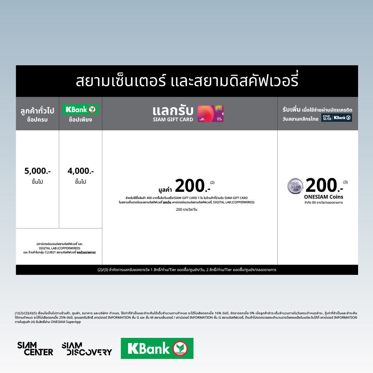 ช็อปสินค้าจากร้านค้าที่ร่วมรายการในศูนย์การค้า สยามเซ็นเตอร์ สยามดิสคัฟเวอรี่ ครบ 5,000 บาทขึ้นไป / บัตรเครดิตกสิกรไทย ช็อปเพียง 4,000 บาทขึ้นไป (เคาน์เตอร์แบรนด์สยามดิสคัฟเวอรี่ และ DIGITAL LAB (COPPERWIRED) และ ร้านค้าในกลุ่ม CLUB21 สยามดิสคัฟเวอรี่งดร่วมรายการ)