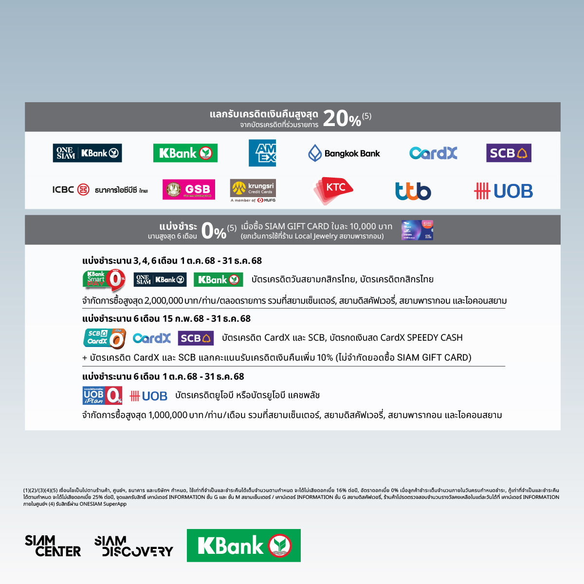 - แบ่งชำระนาน 6 เดือน สำหรับบัตรเครดิต CardX และ SCB แลกคะแนนรับเครดิตเงินคืนเพิ่ม 10% (ไม่จำกัดยอดซื้อ SIAM GIFT CARD)