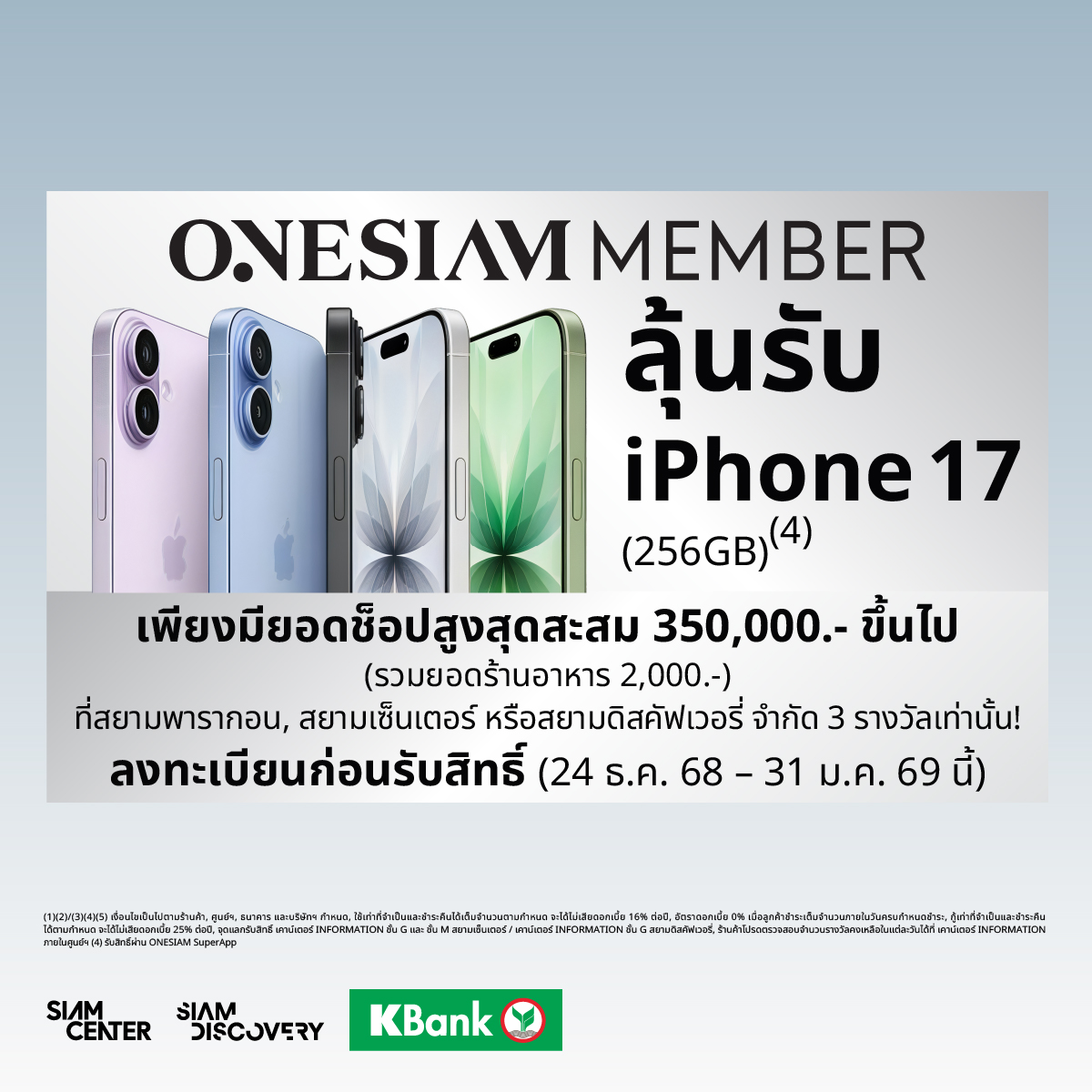 สิทธิพิเศษสำหรับสมาชิก ONESIAM ที่มี ONESIAM MEMBER ลุ้นรับ iPhone 17 (256GB)(4) เพียงมียอดช็อปสูงสุด 350,000 ขึ้นไป โดยลงทะเบียนก่อนรับสิทธิ์ (24 ธันวาคม 2568 - 31 มกราคม 2569)