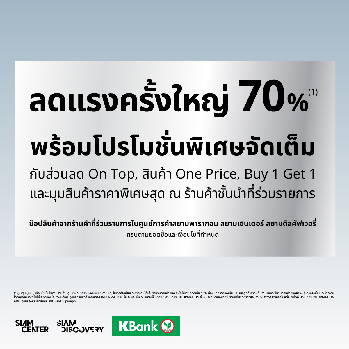 16. สอบถามรายละเอียดเพิ่มเติมได้ที่ K-CONTACT CENTER 0 2888 8888 หรือเงื่อนไขเพิ่มเติมที่ Information Counter หรือติดต่อสอบถามเพิ่มเติมได้ที่ ONESIAM Call Center โทร: 02-111-6161 email: contact@onesiam.com