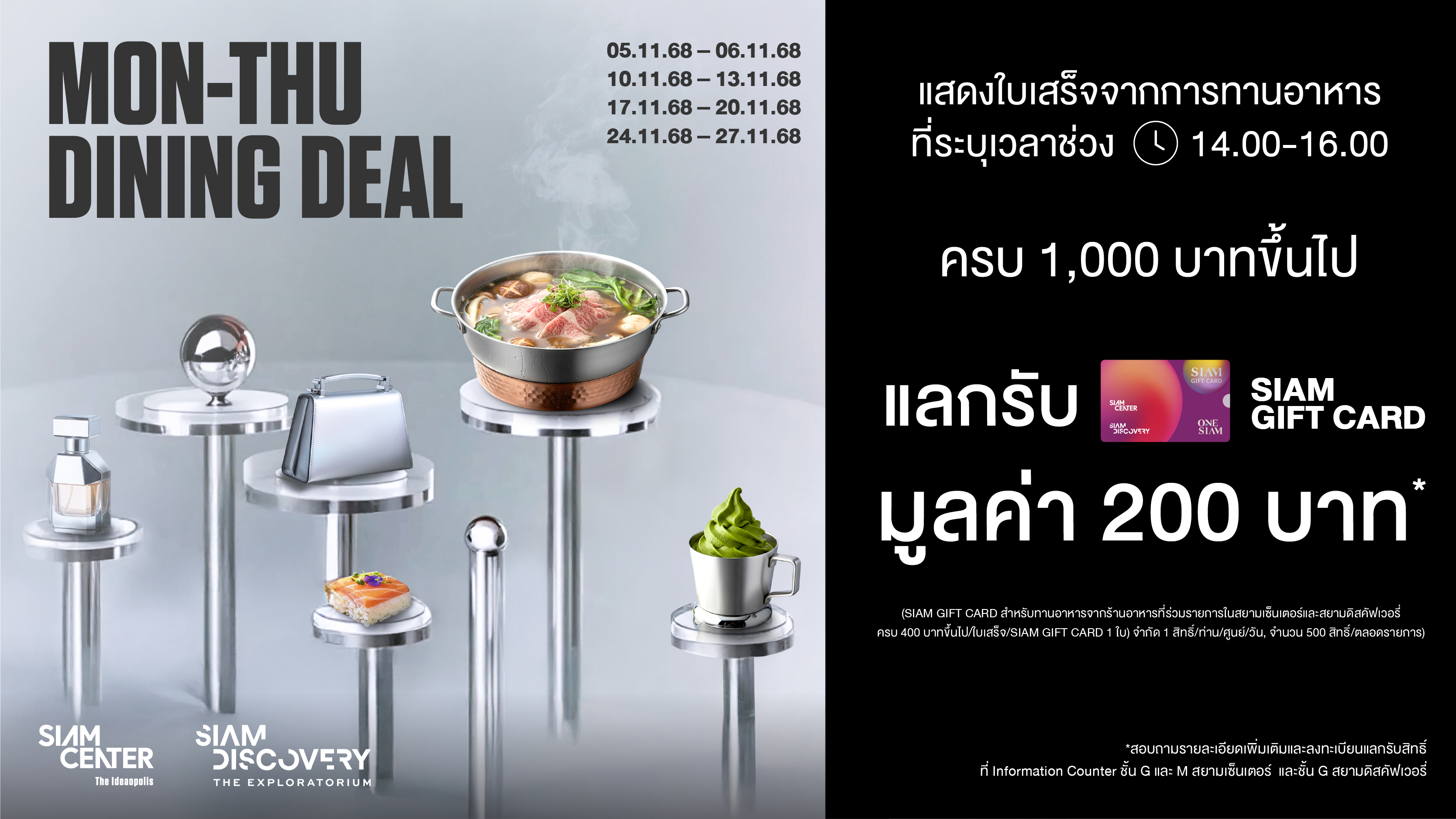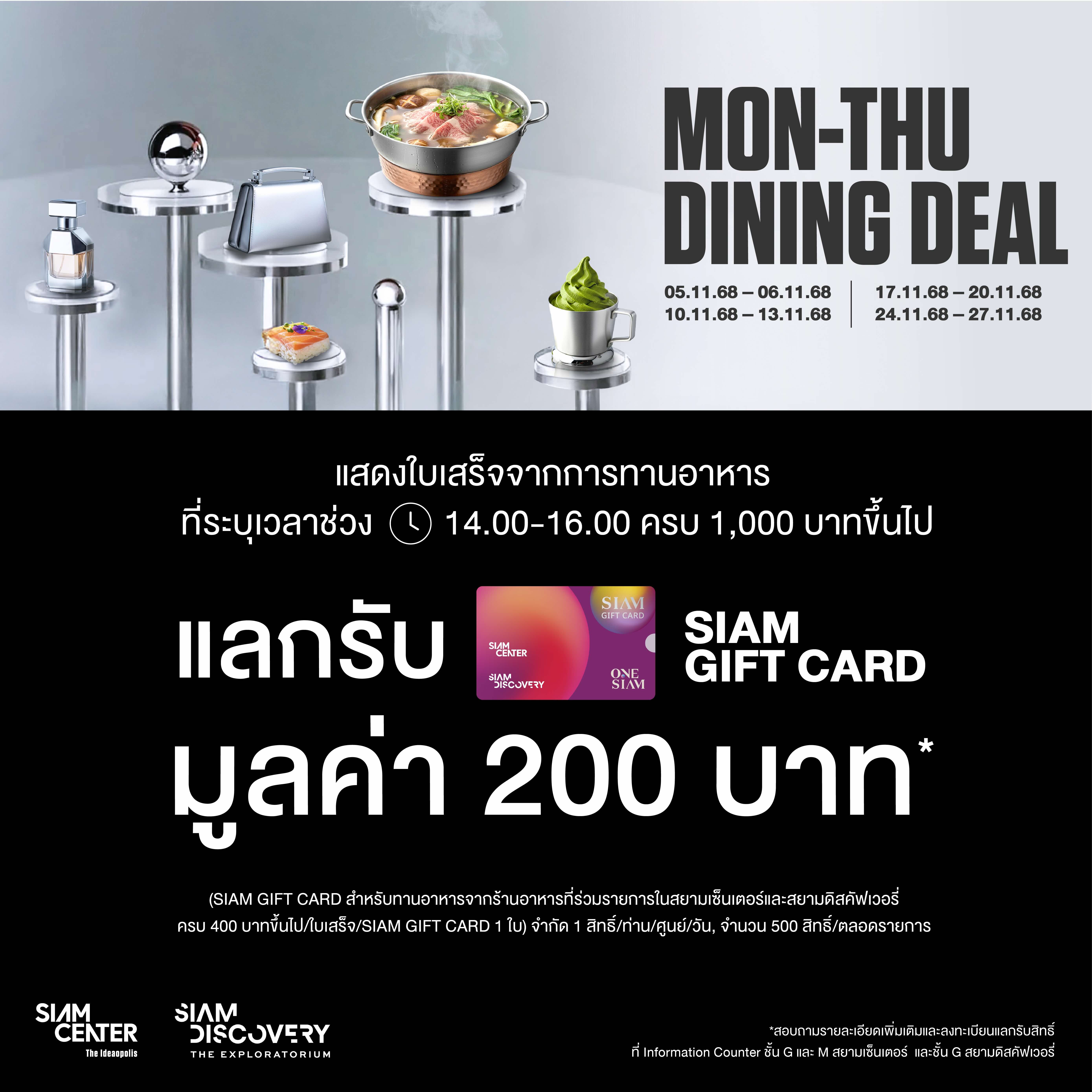 - แลกรับ SIAM GIFT CARD มูลค่า 200 บาท (SIAM GIFT CARD สำหรับทานอาหารจากร้านอาหารที่ร่วมรายการในสยามเซ็นเตอร์และสยามดิสคัฟเวอรี่ ครบ 400 บาทขึ้นไป/ใบเสร็จ/SIAM GIFT CARD 1 ใบ)
