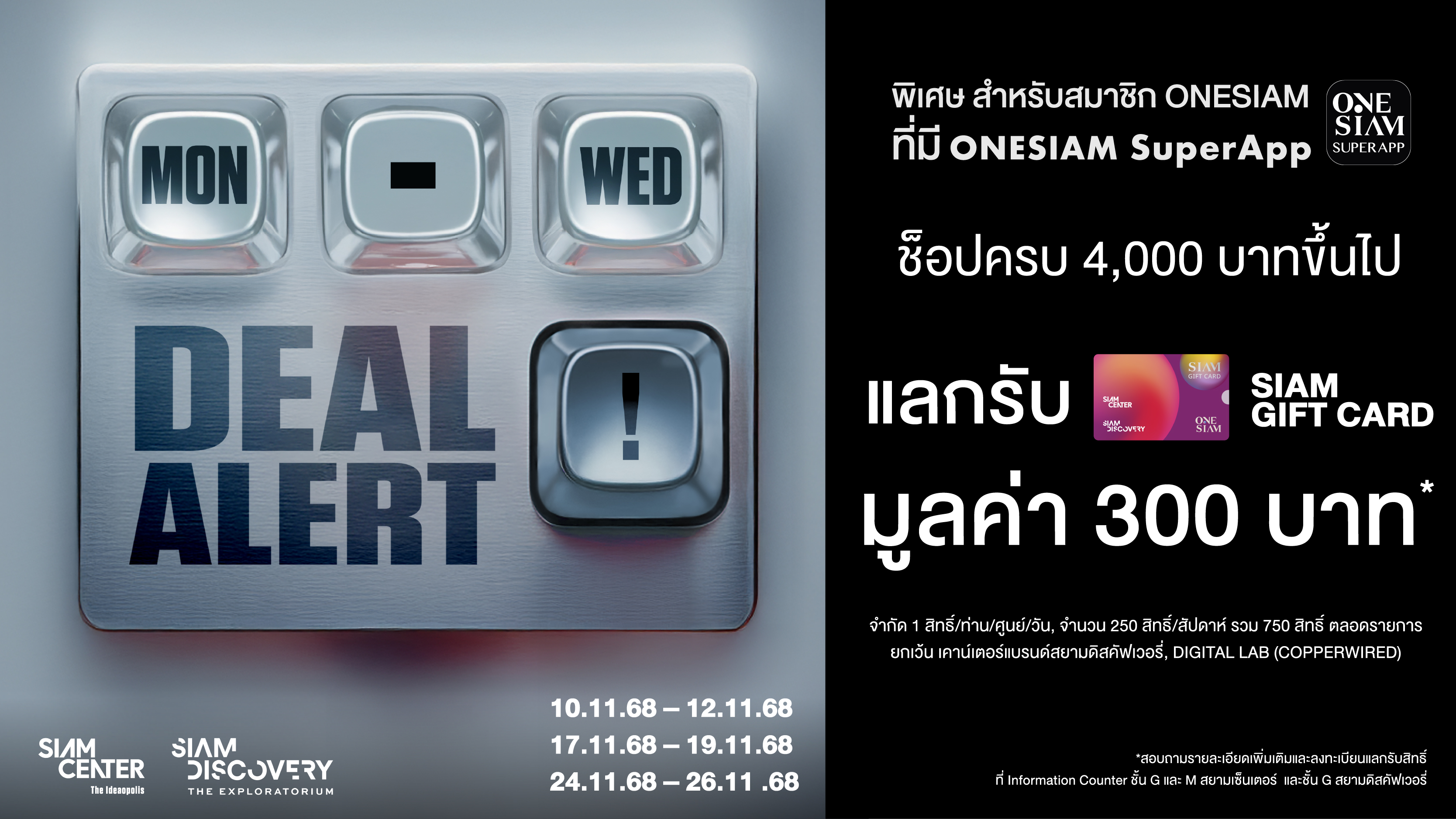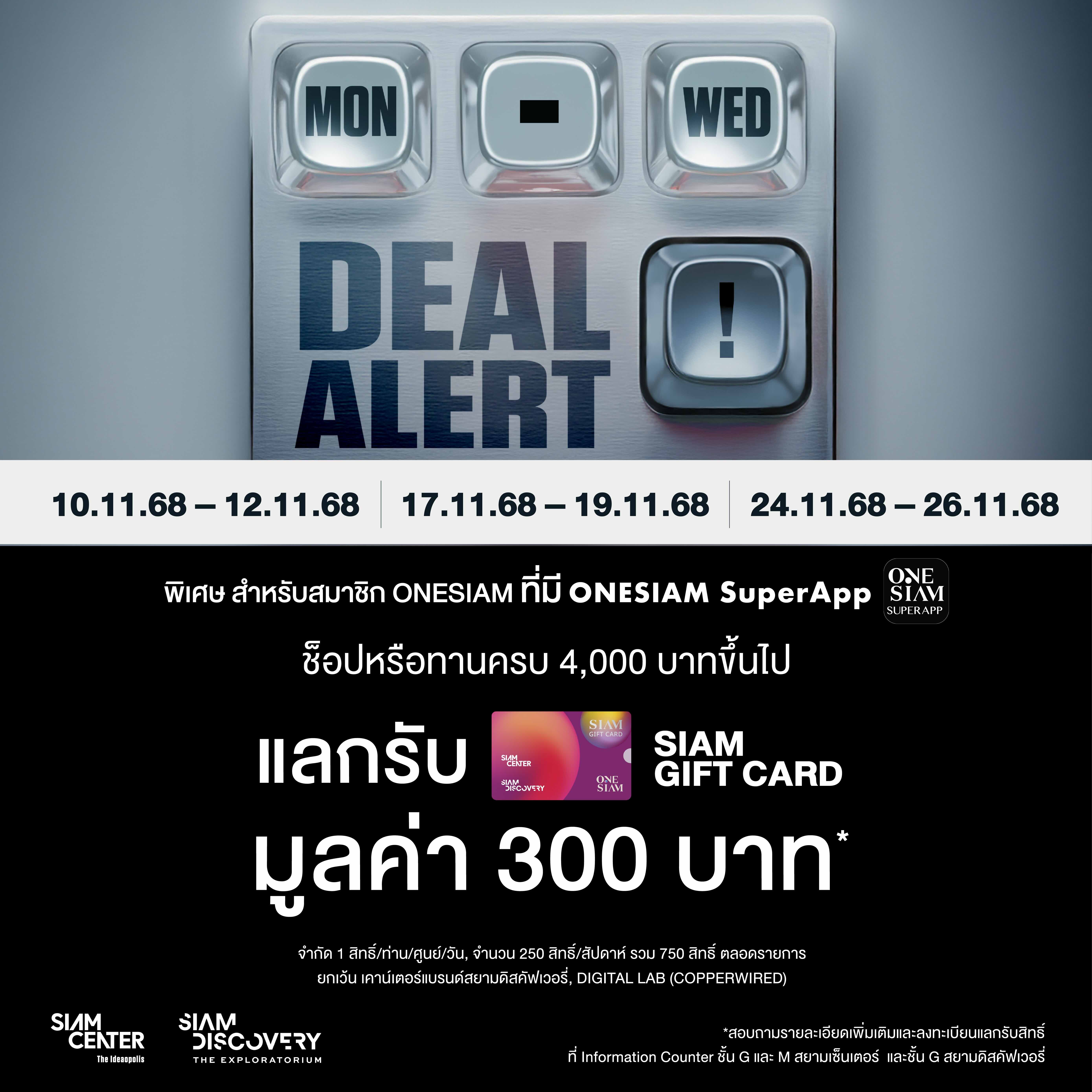 - แลกรับ SIAM GIFT CARD มูลค่า 300 บาท (SIAM GIFT CARD สำหรับซื้อสินค้าหรือทานอาหารจากร้านค้าและร้านอาหารที่ร่วมรายการในสยามเซ็นเตอร์และสยามดิสคัฟเวอรี่ ครบ 600 บาทขึ้นไป/ใบเสร็จ/SIAM GIFT CARD 1 ใบ)