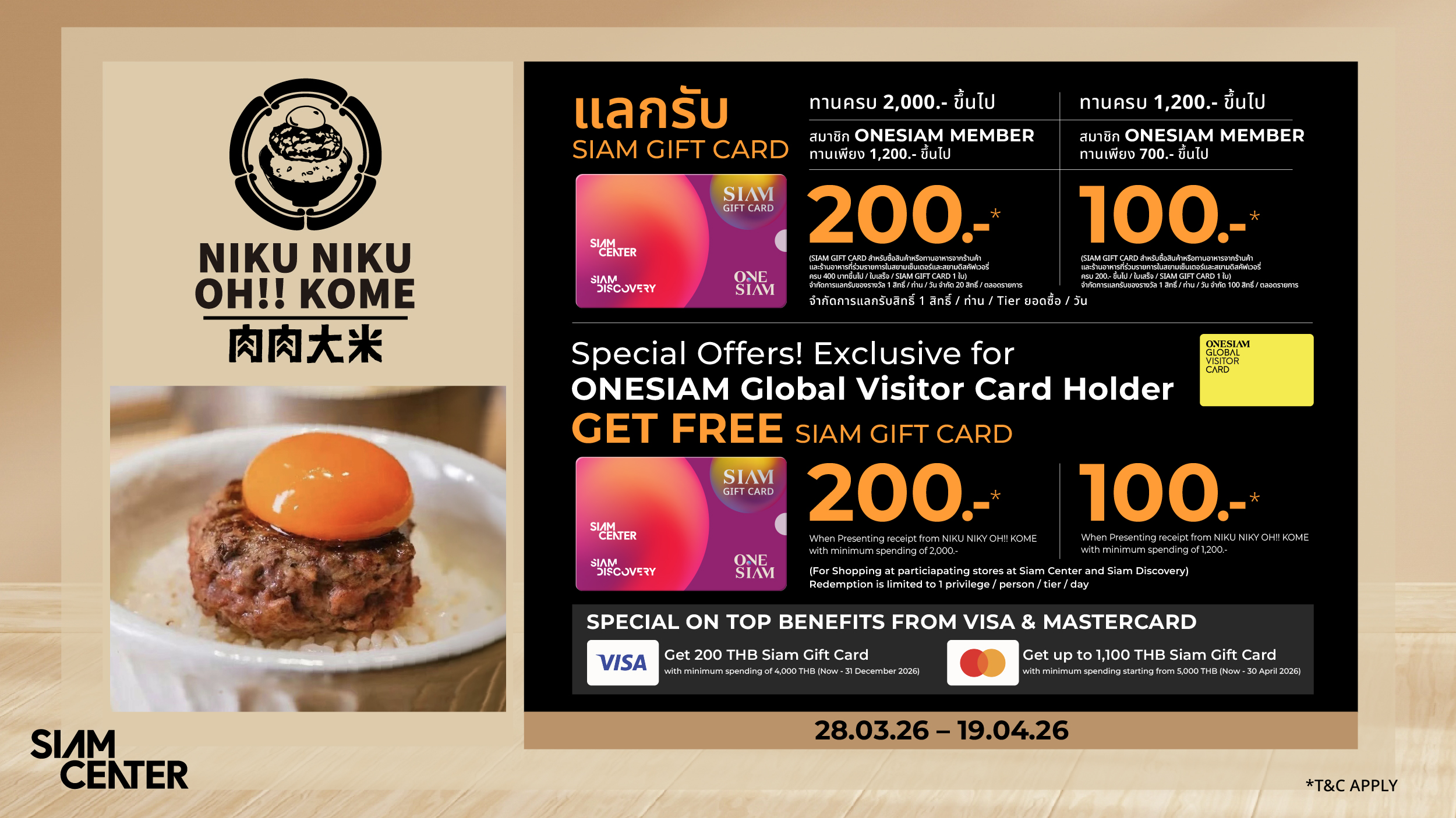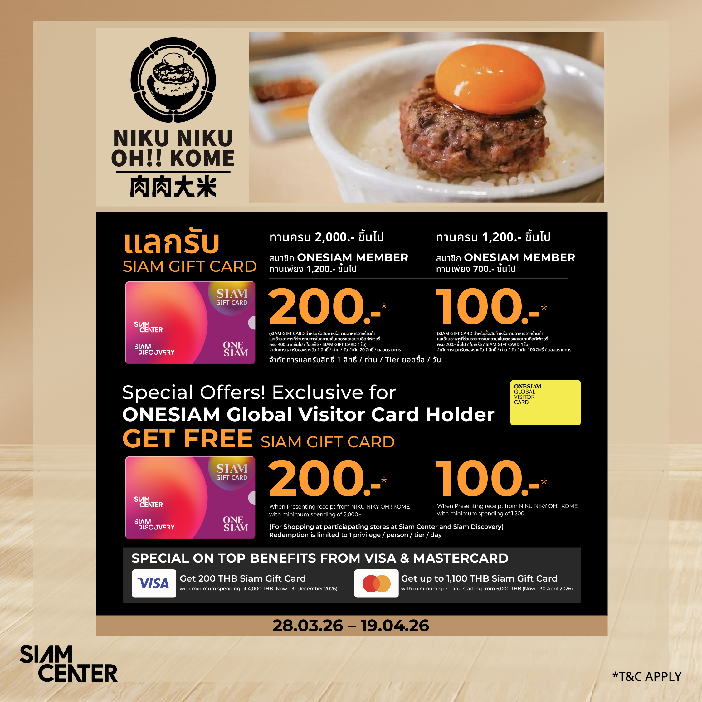 พิเศษสำหรับสมาชิก ONESIAM MEMBER และ ONESIAM GLOBAL VISITOR ทานเพียง 700 บาทขึ้นไป แลกรับ SIAM GIFT CARD มูลค่า 100 บาท* (SIAM GIFT CARD สำหรับซื้อสินค้าหรือทานอาหารจากร้านค้าและร้านอาหารที่ร่วมรายการในสยามเซ็นเตอร์และสยามดิสคัฟเวอรี่ ครบ 200 บาทขึ้นไป/ใบเสร็จ/SIAM GIFT CARD 1 ใบ) จำกัดการแลกรับของรางวัล 1 สิทธิ์/ท่าน/วัน, จำกัด 100 สิทธิ์/ตลอดรายการ