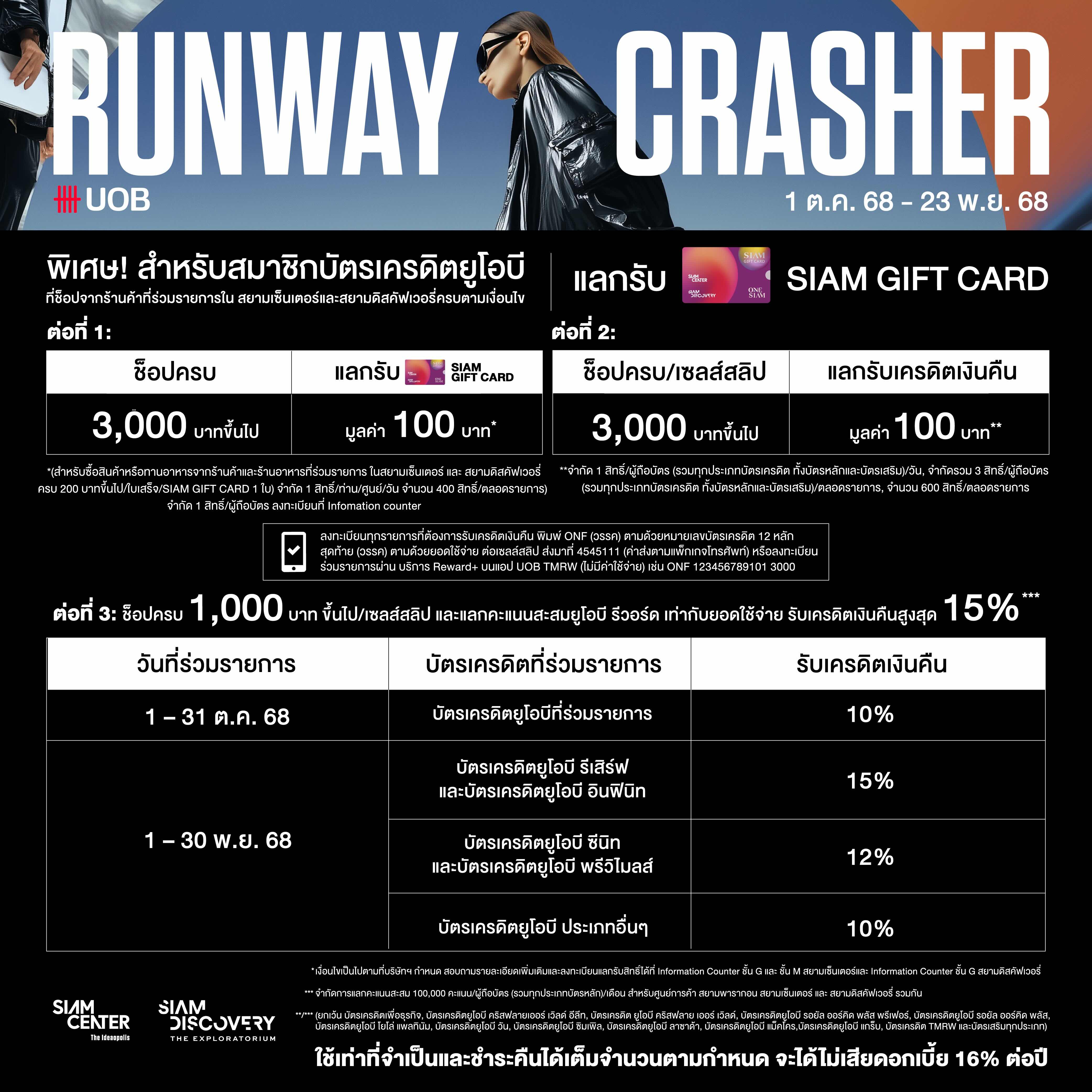 2. รับเครดิตเงินคืนเมื่อมียอดใช้จ่ายผ่านบัตรเครดิตยูโอบี และแลกคะแนนสะสมยูโอบีตั้งแต่ 1,000 บาทขึ้นไป/ เซลส์สลิป จำกัดการแลกคะแนนสะสมสูงสุด 100,000 คะแนน รวมทุกรายการใช้จ่าย ณ สยามพารากอน สยามเซ็นเตอร์ และ สยามดิสคัฟเวอรี่ ผ่านบัตรเครดิตยูโอบีที่ร่วมรายการทุกประเภท/ผู้ถือบัตร (รวมทุกประเภทบัตรหลัก)/ตลอดรายการ ระยะเวลารายการส่งเสริมการขาย ดังนี้