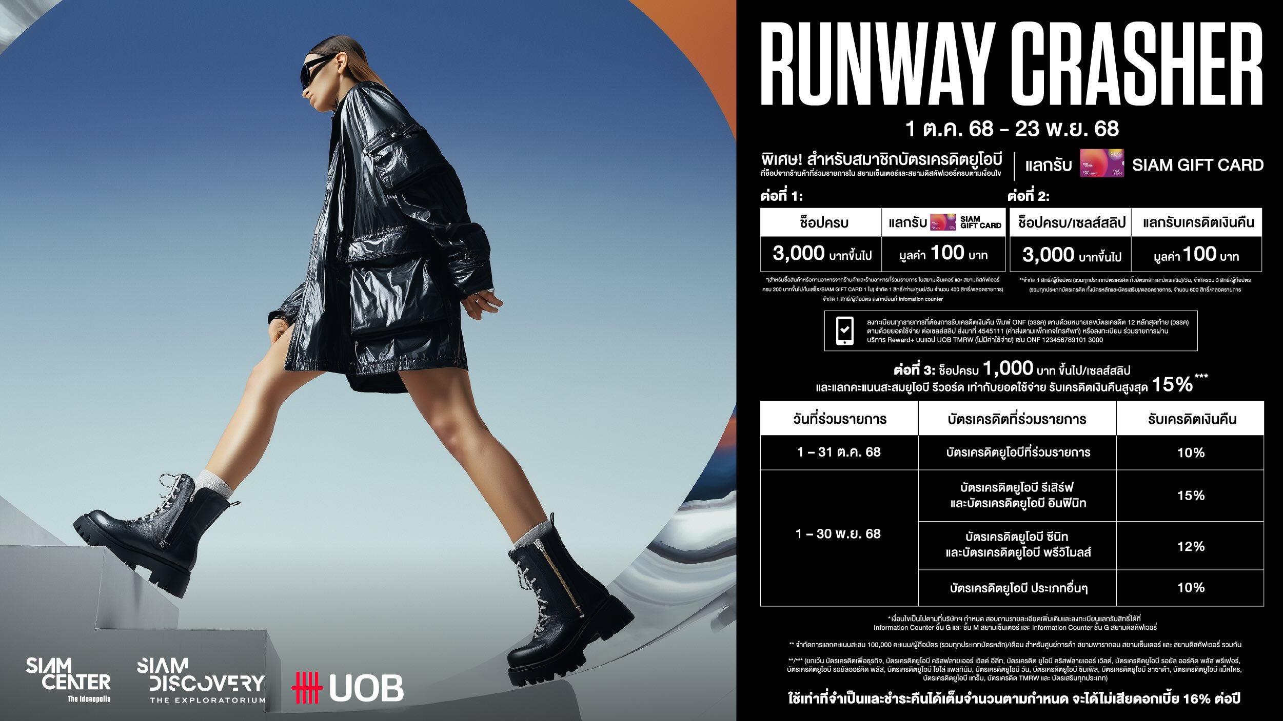 - สิทธิพิเศษ ต่อที่ 3: แลกรับเครดิตเงินคืนสูงสุด 15% (ระหว่างวันที่ 1 ต.ค. 68 – 30 พ.ย. 68) เมื่อช็อปครบ 1,000 บาทขึ้นไป/เซลล์สลิป และแลกคะแนนสะสมยูโอบี รีวอร์ด เท่ากับยอดใช้จ่าย