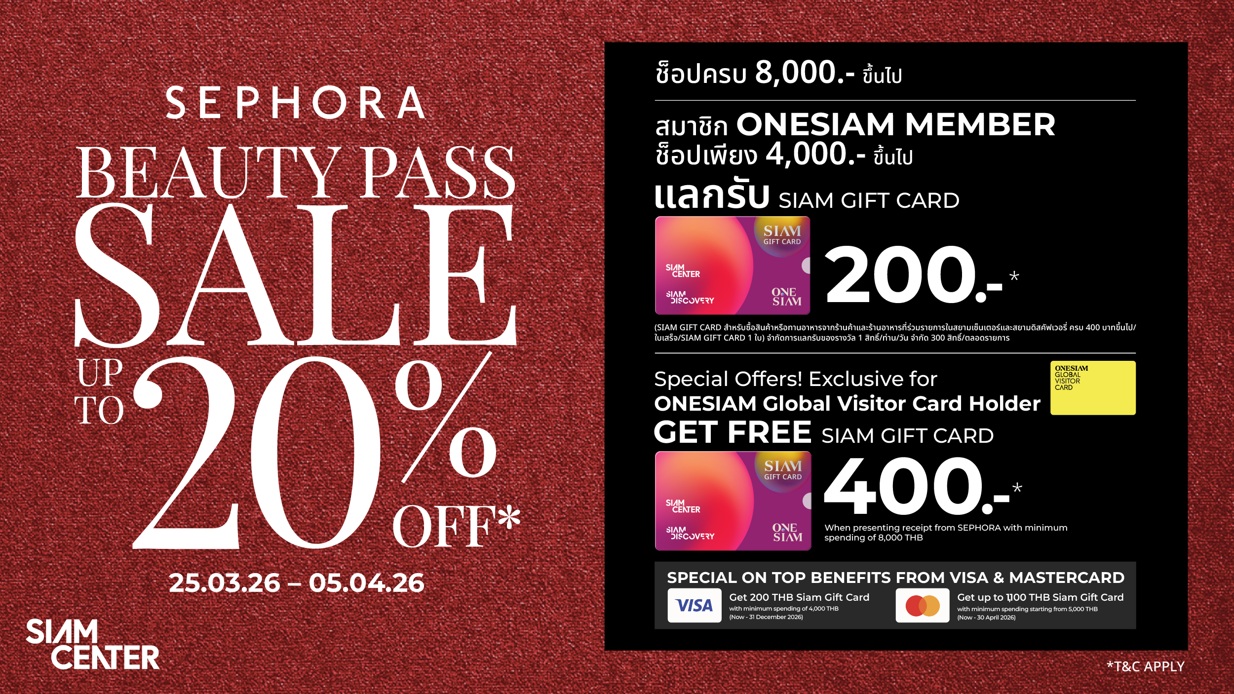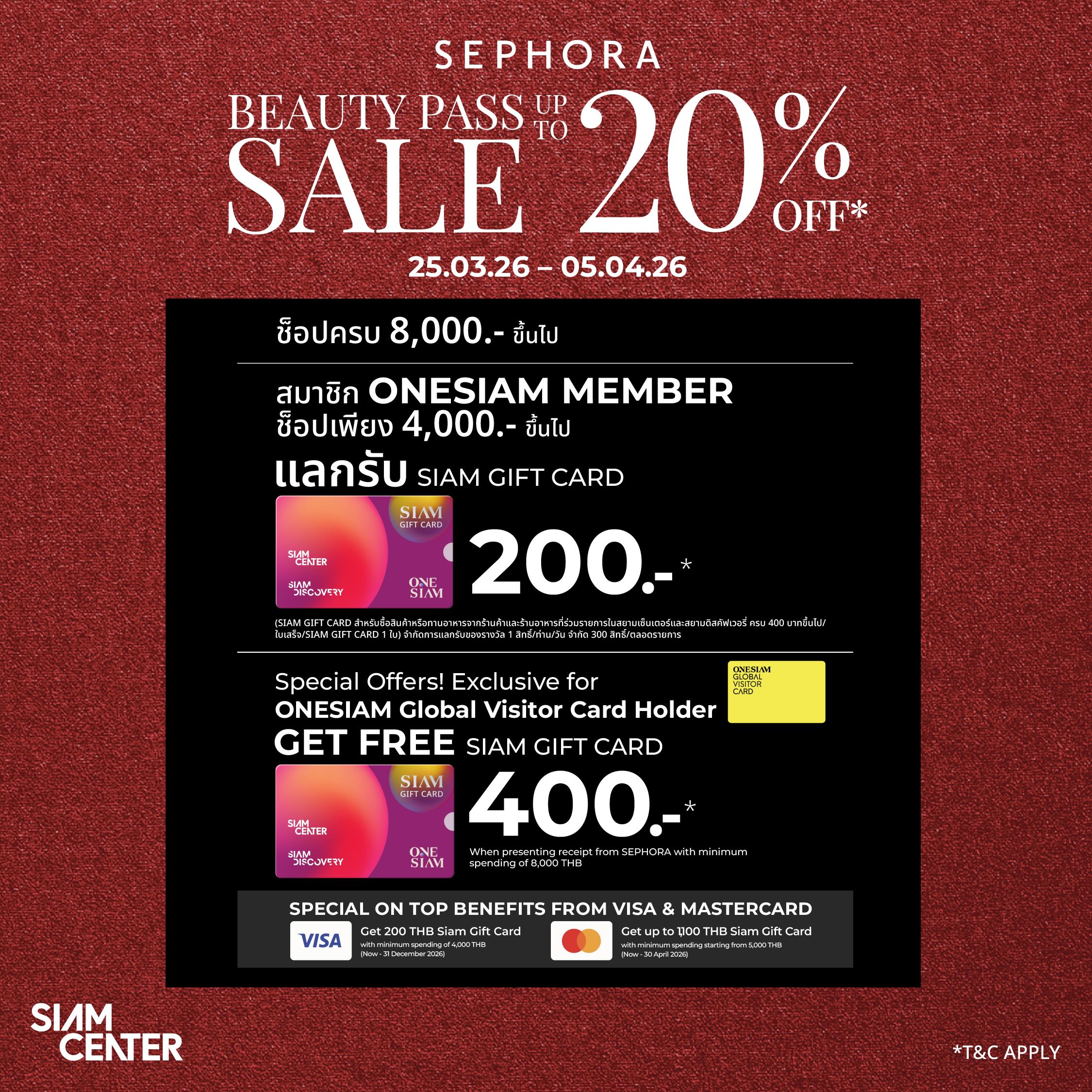 ลูกค้าทั่วไปและสมาชิก ONESIAM GLOBAL VISITOR ช็อปครบ 8,000 บาทขึ้นไป พิเศษสำหรับ ONESIAM MEMBER ช็อปเพียง 4,000 บาทขึ้นไป แลกรับ SIAM GIFT CARD มูลค่า 200 บาท (SIAM GIFT CARD สำหรับซื้อสินค้าหรือทานอาหารจากร้านค้าและร้านอาหารที่ร่วมรายการในสยามเซ็นเตอร์และสยามดิสคัฟเวอรี่ ครบ 400 บาทขึ้นไป/ใบเสร็จ/SIAM GIFT CARD 1 ใบ) จำกัดการแลกรับของรางวัล 1 สิทธิ์/ท่าน/วัน, จำกัด 300 สิทธิ์/ตลอดรายการ