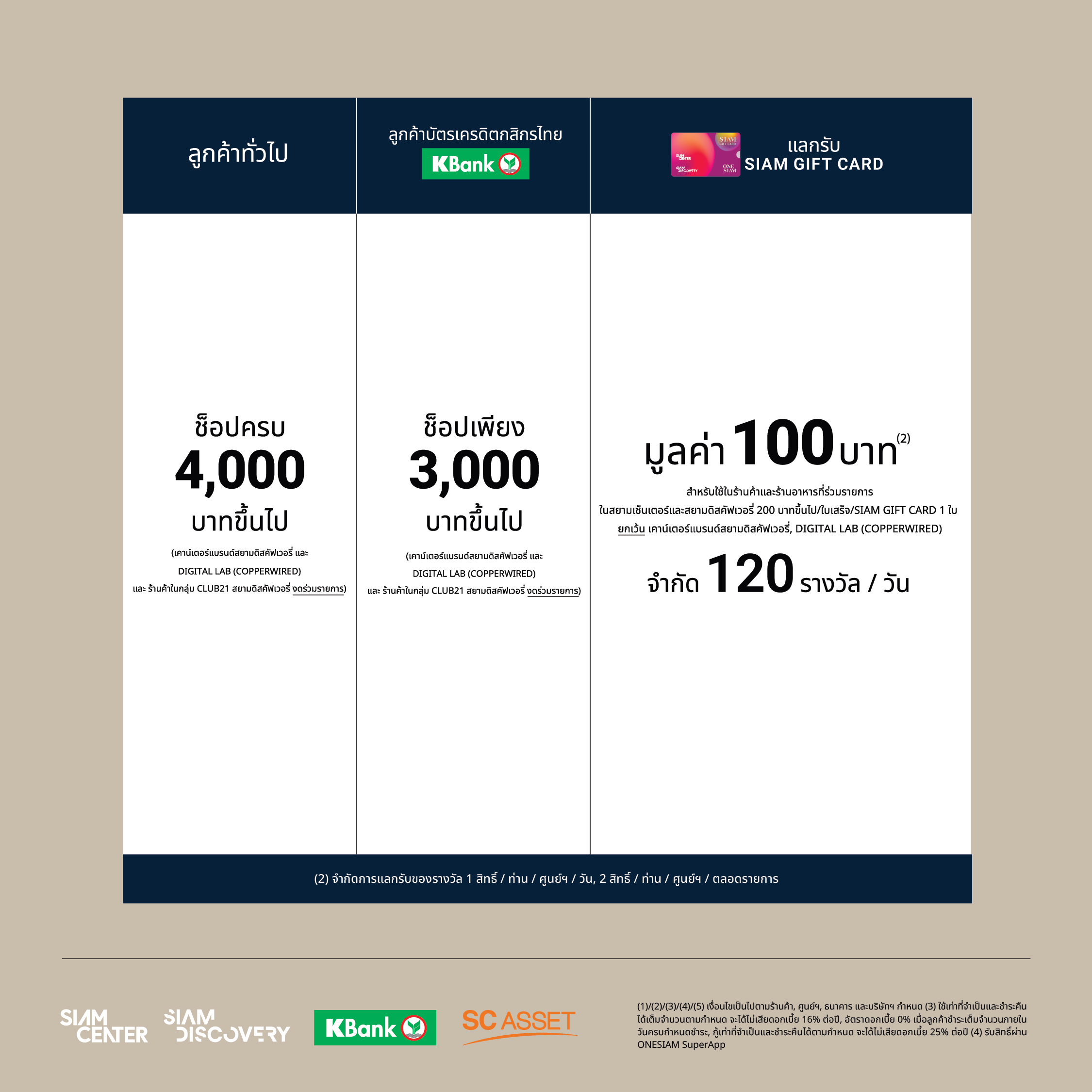 พิเศษ! ใช้จ่ายผ่านบัตรเครดิตกสิกรไทย เพียง 3,000 บาทขึ้นไป แลกรับ SIAM GIFT CARD มูลค่า 400 บาท(2)