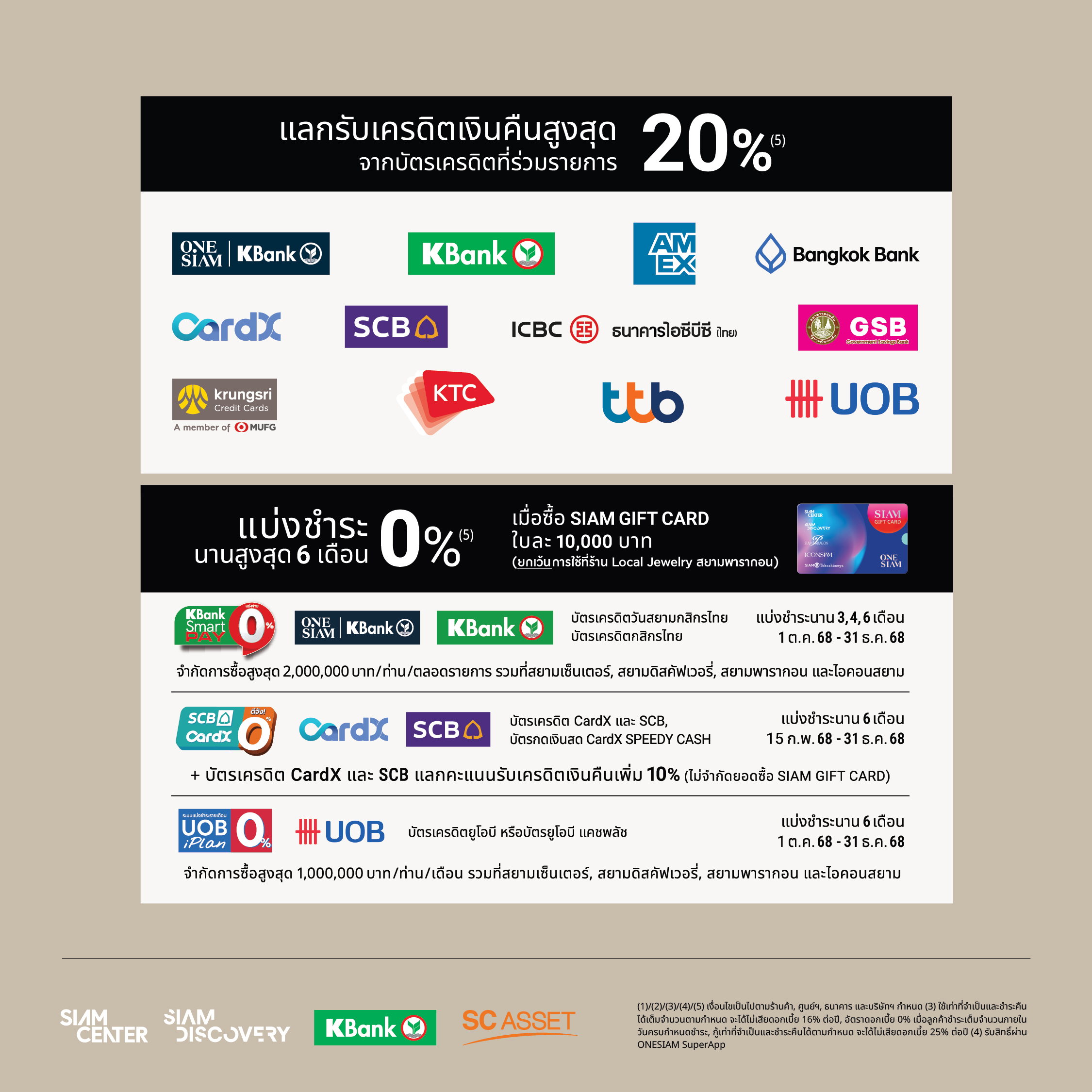 2. สิทธิพิเศษสำหรับผู้ใช้จ่ายผ่านบัตรเครดิตกสิกรไทย รวบรวมใบเสร็จจากการซื้อสินค้าและบริการจากร้านค้าที่ร่วมรายการในศูนย์การค้าสยามพารากอน สยามเซ็นเตอร์ สยามดิสคัฟเวอรี่ พร้อมเซลส์สลิปที่ใช้จ่ายภายใต้ชื่อ-สกุลเดียวกัน หมายเลขบัตรเครดิตเดียวกัน และในวันเดียวกัน ตามยอดและเงื่อนไขที่กำหนด ลงทะเบียนแลกรับของรางวัล ภายในวันเดียวกันระหว่างวันที่ 29 พ.ย. 68 – 11 ม.ค. 69 ที่เคาน์เตอร์ INFORMATION สยามพารากอน ชั้น G ฝั่ง NORTH และ ชั้น 1 ฝั่ง STAR DOME, สยามเซ็นเตอร์ ชั้น G และ ชั้น M และ สยามดิสคัฟเวอรี่ ชั้น G