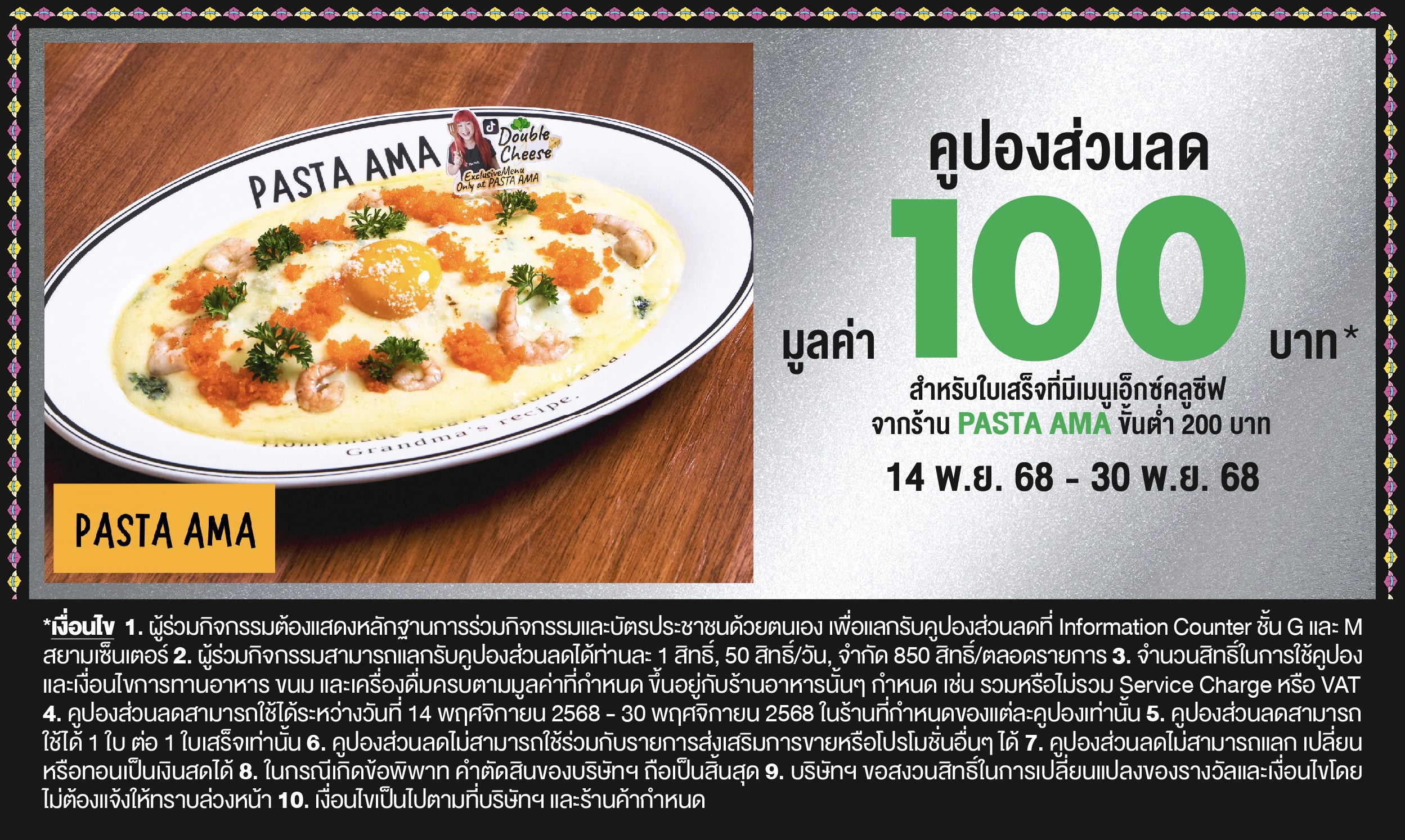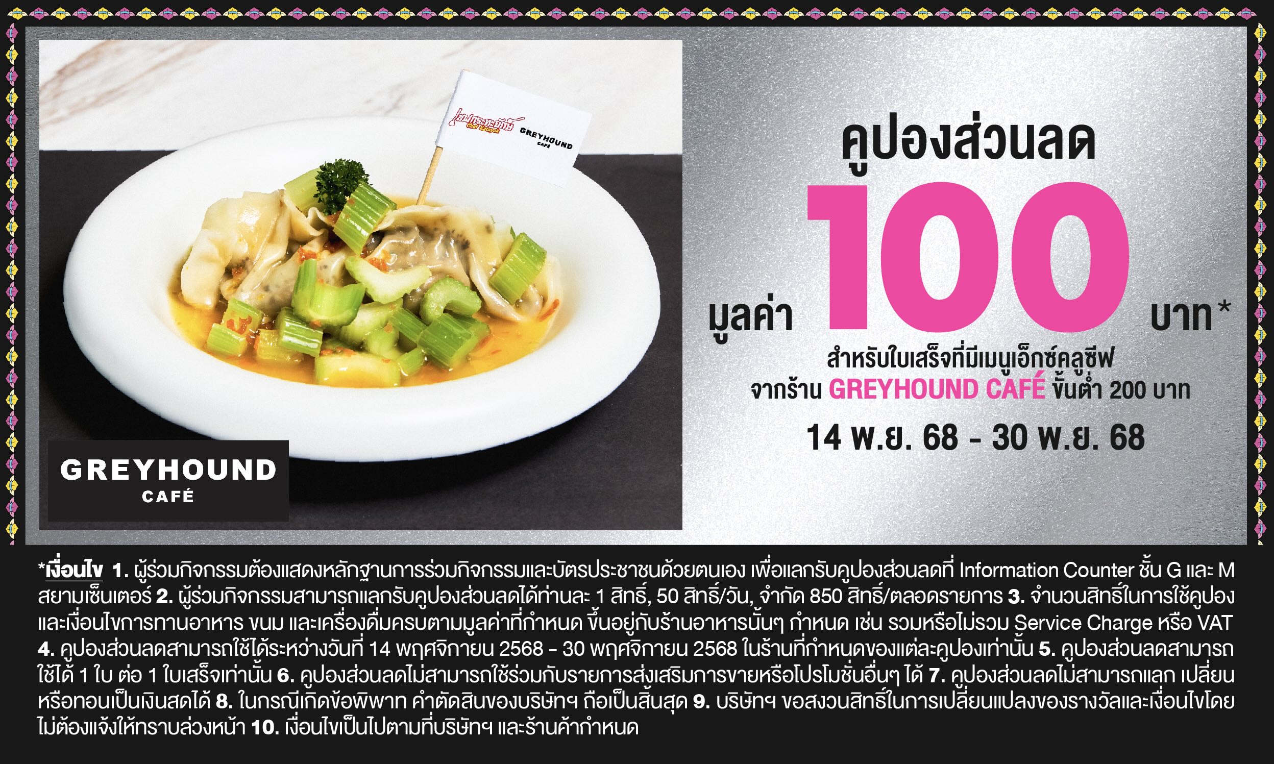 - เลือกคูปองมูลค่า 100 บาท 1 คูปอง โดยสามารถใช้ได้เมื่อทานอาหารขั้นต่ำ 200 บาท* จากร้านอาหาร 3 ร้านที่ร่วมสร้างสรรค์เมนูเอ็กซ์คลูซีฟ โดยจะต้องมีเมนูนั้นๆ อยู่ในบิลด้วย ได้แก่ Chathai Fighting, Greyhound Cafe และ Pasta Ama