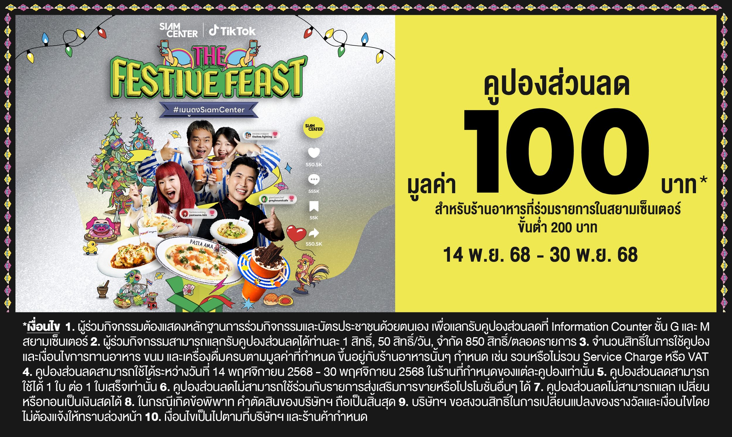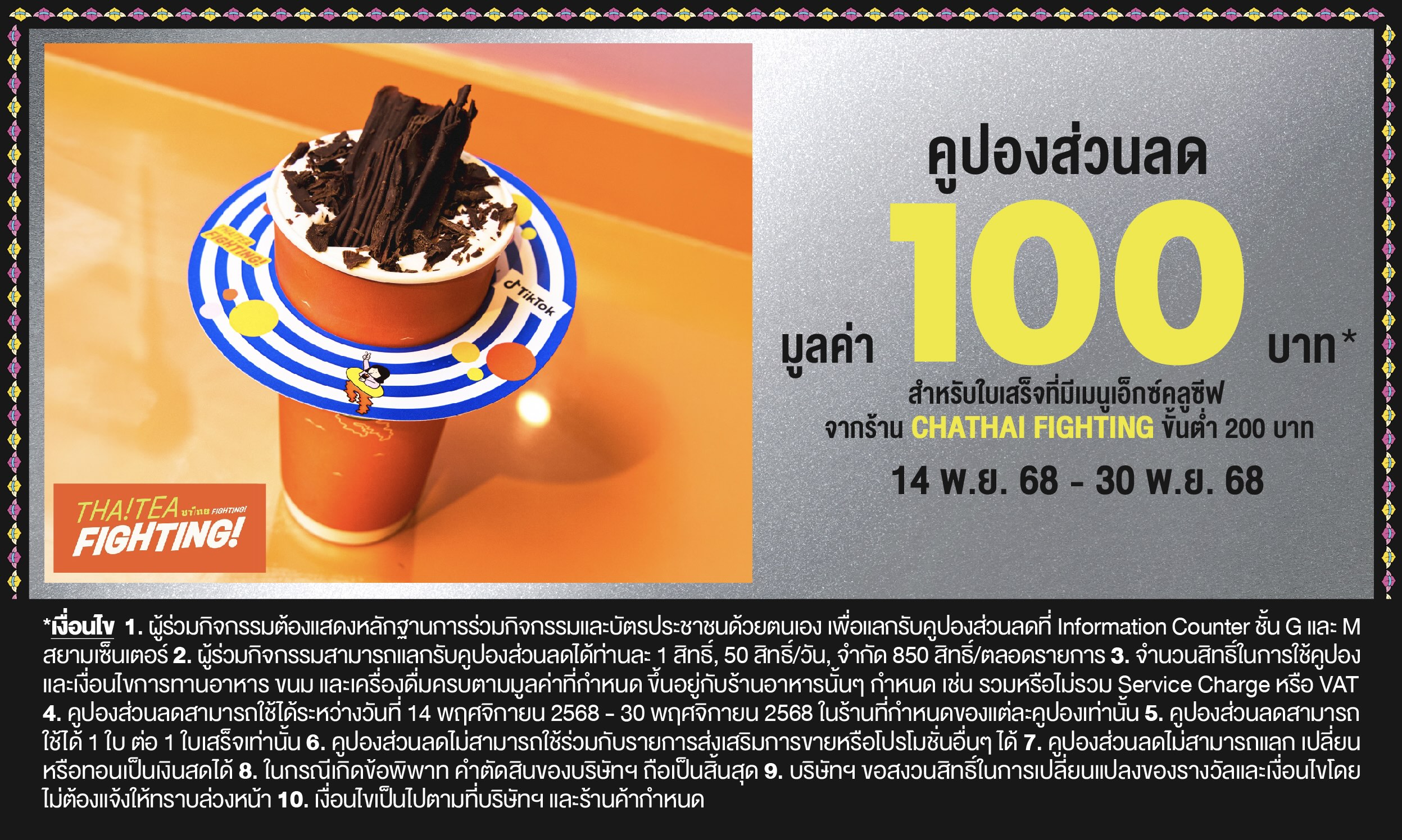 - คูปองมูลค่า 100 บาท สามารถใช้ได้เมื่อทานอาหารขั้นต่ำ 200 บาท* ในร้านอาหาร 24 ร้านที่สยามเซ็นเตอร์ (สามารถตรวจสอบร้านอาหารที่ร่วมรายการได้ในเว็บไซต์ www.siamcenter.co.th)