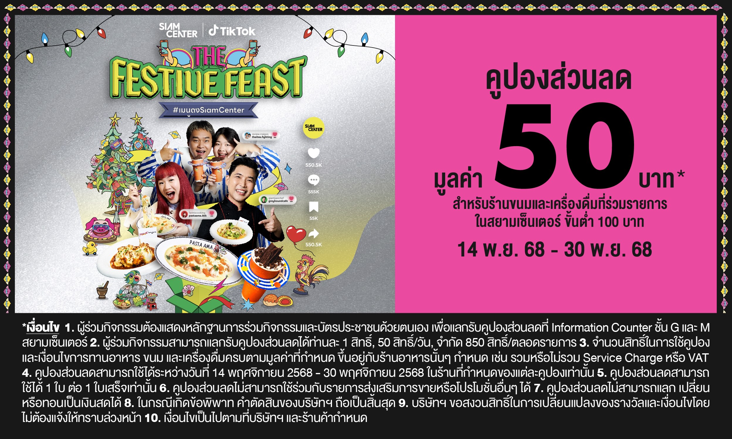- คูปองมูลค่า 50 บาท สามารถใช้ได้เมื่อทานขนมและเครื่องดื่มขั้นต่ำ 100 บาท* ในร้านขนมและเครื่องดื่ม 13 ร้านที่สยามเซ็นเตอร์ (สามารถตรวจสอบร้านอาหารที่ร่วมรายการได้ในเว็บไซต์ www.siamcenter.co.th)