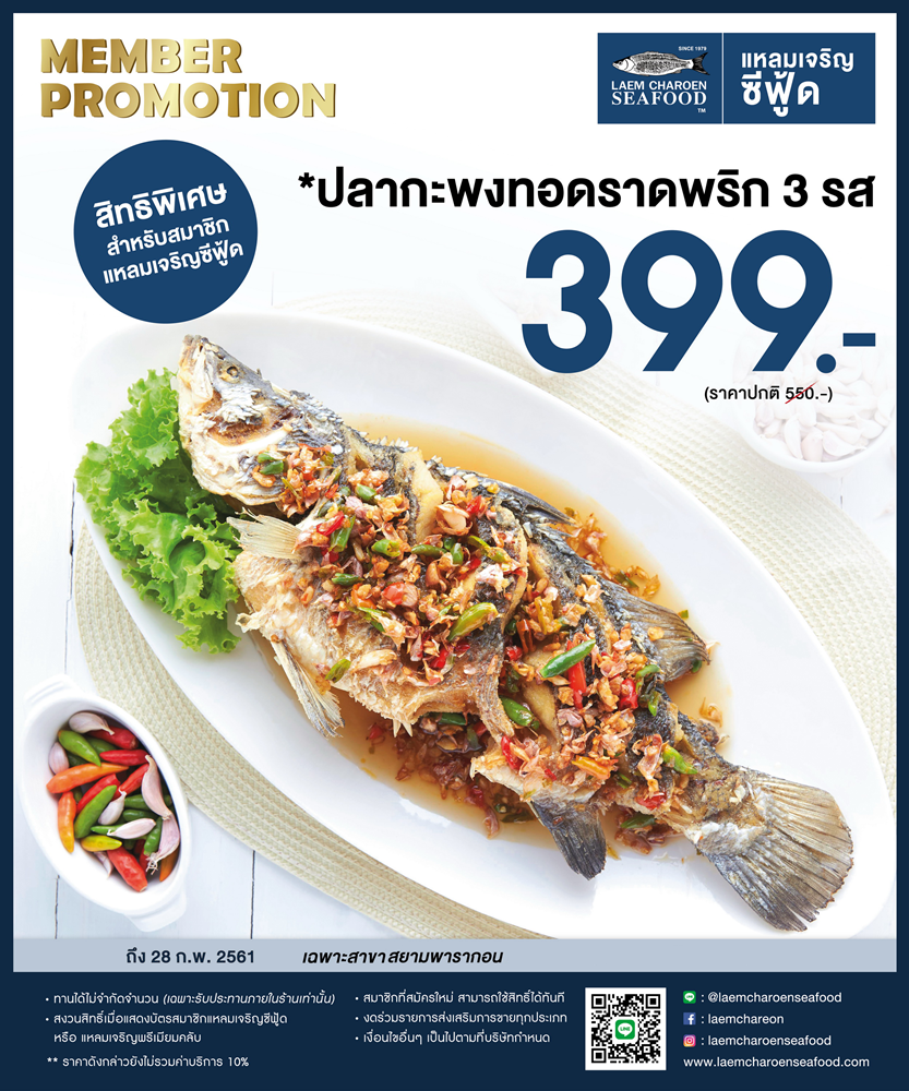 สำหรับสมาชิกแหลมเจริญซีฟู้ด สามารถสั่งปลากะพงราดพริก 3 รสในราคา 399 บาท จากราคาปกติ 550 บาท ตั้งแต่วันที่ 1-28 กุมภาพันธ์ 2561